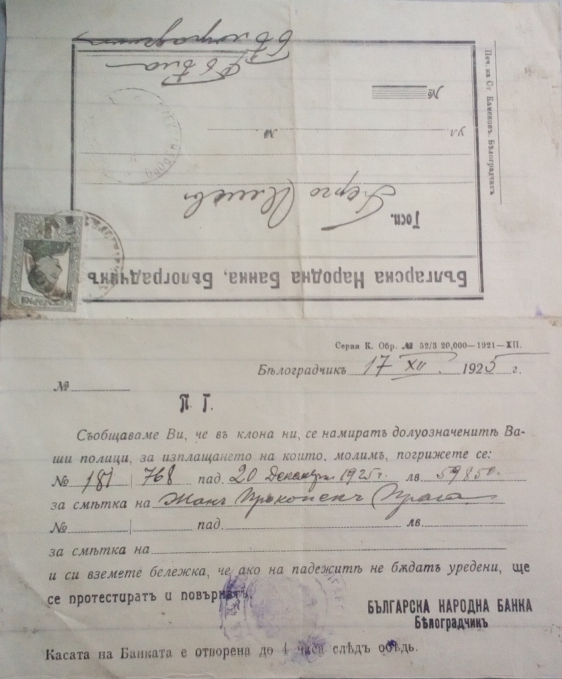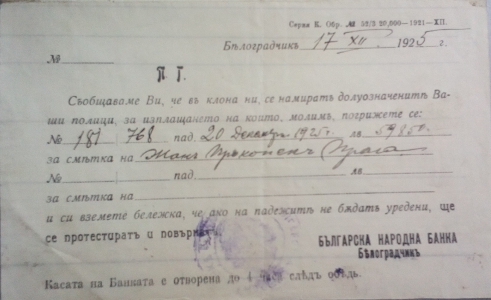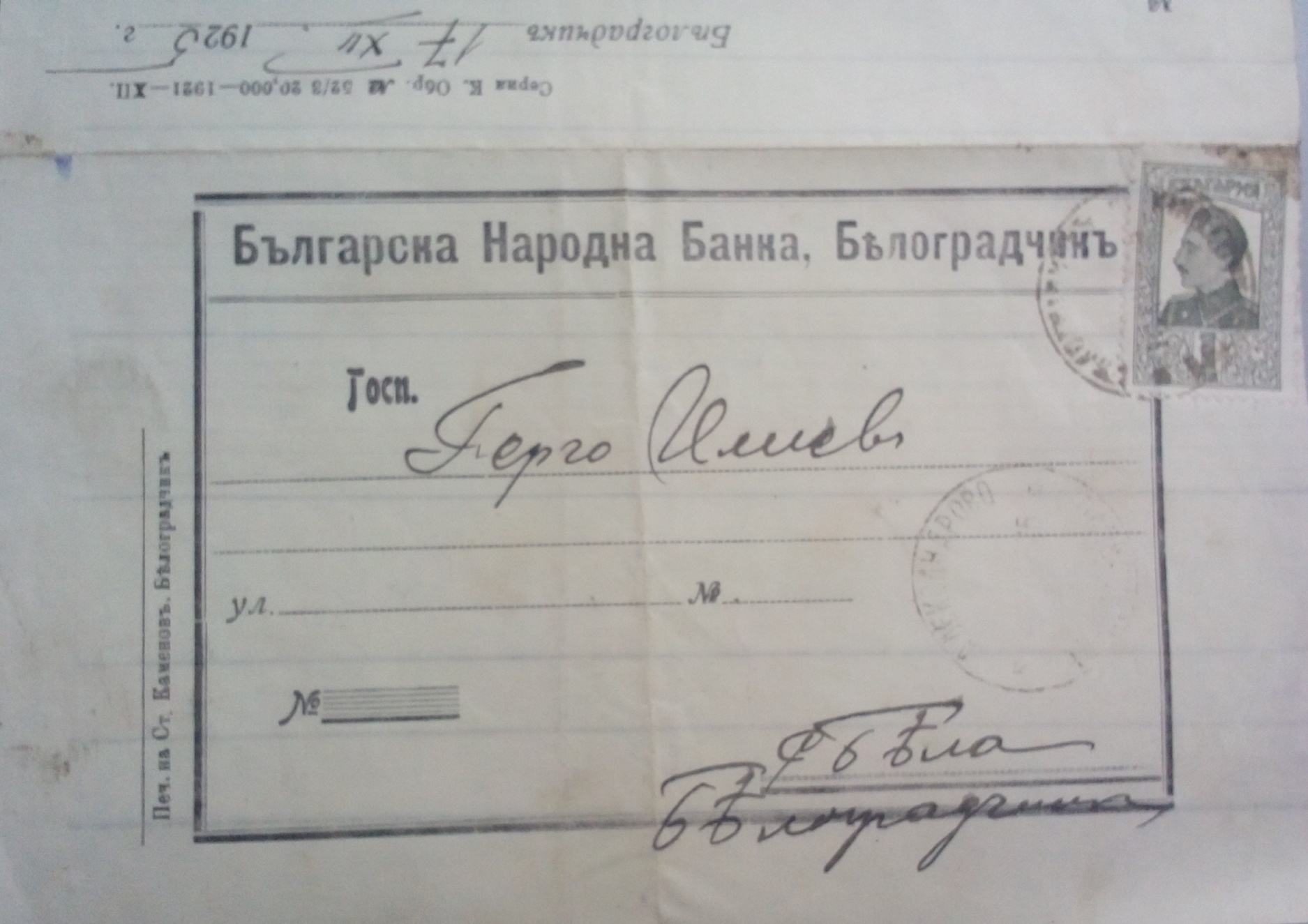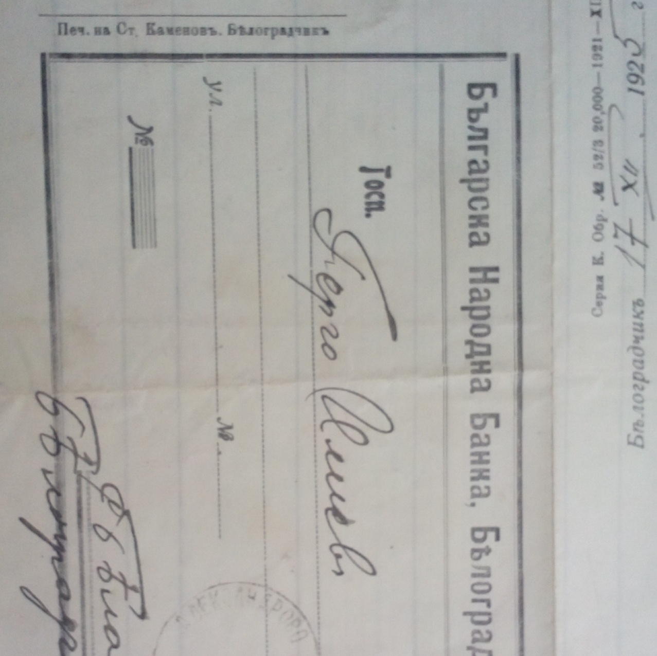 Бланката на Българска Народна Банка, Белоградчик е отпечатана в печатницата на Ст.Каменов, Белоградчик