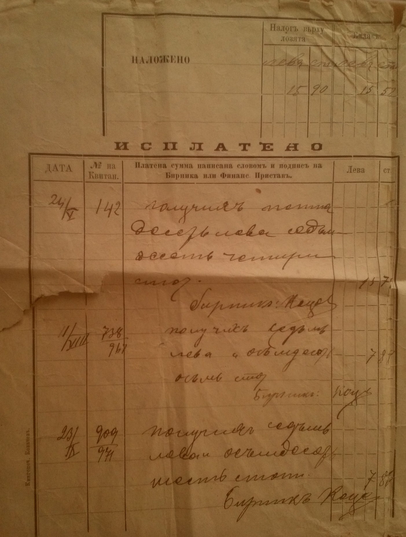 Данъчен лист на Илио Пешев от село Бела за наложените му преки днъци за 1892 година.