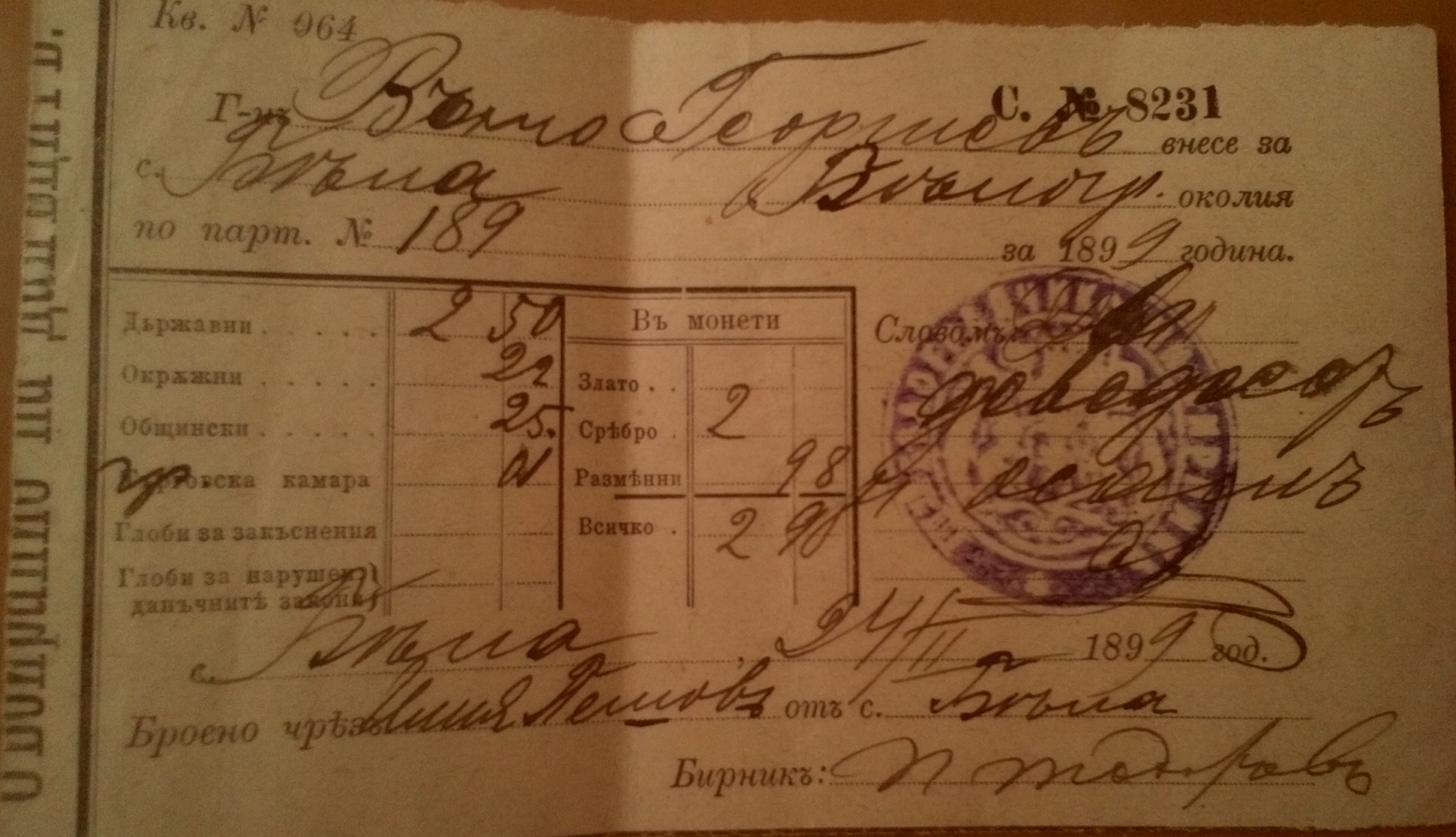 Господин Вълчо Иванов внесе за село Бела, Белоградчишка околия по парт. N 189 за 1899 година. Броено чрез Илия Пешов от с.Бела