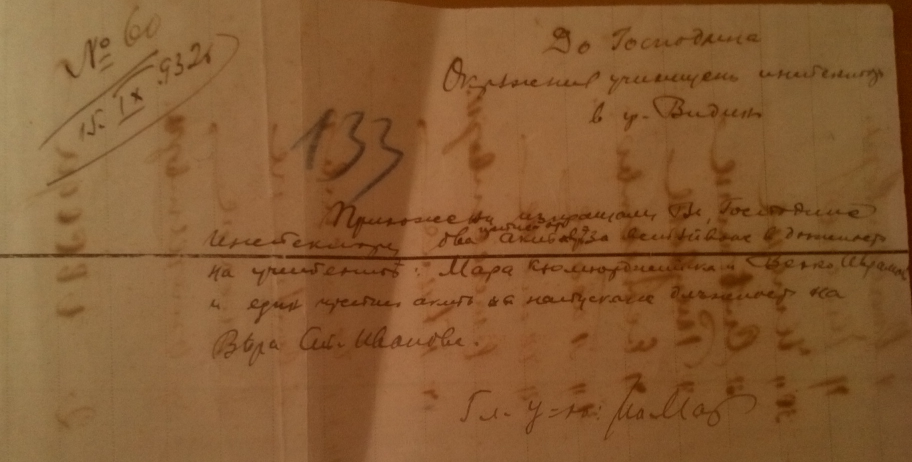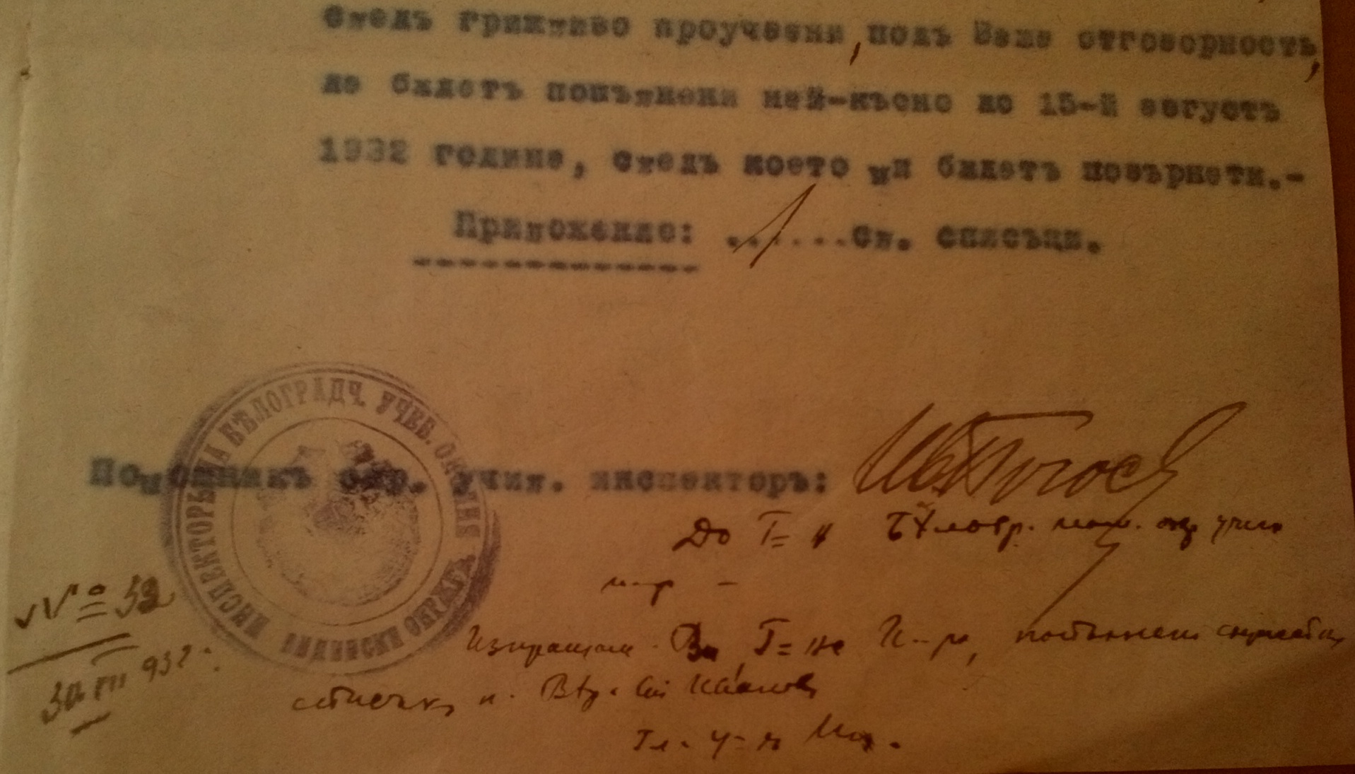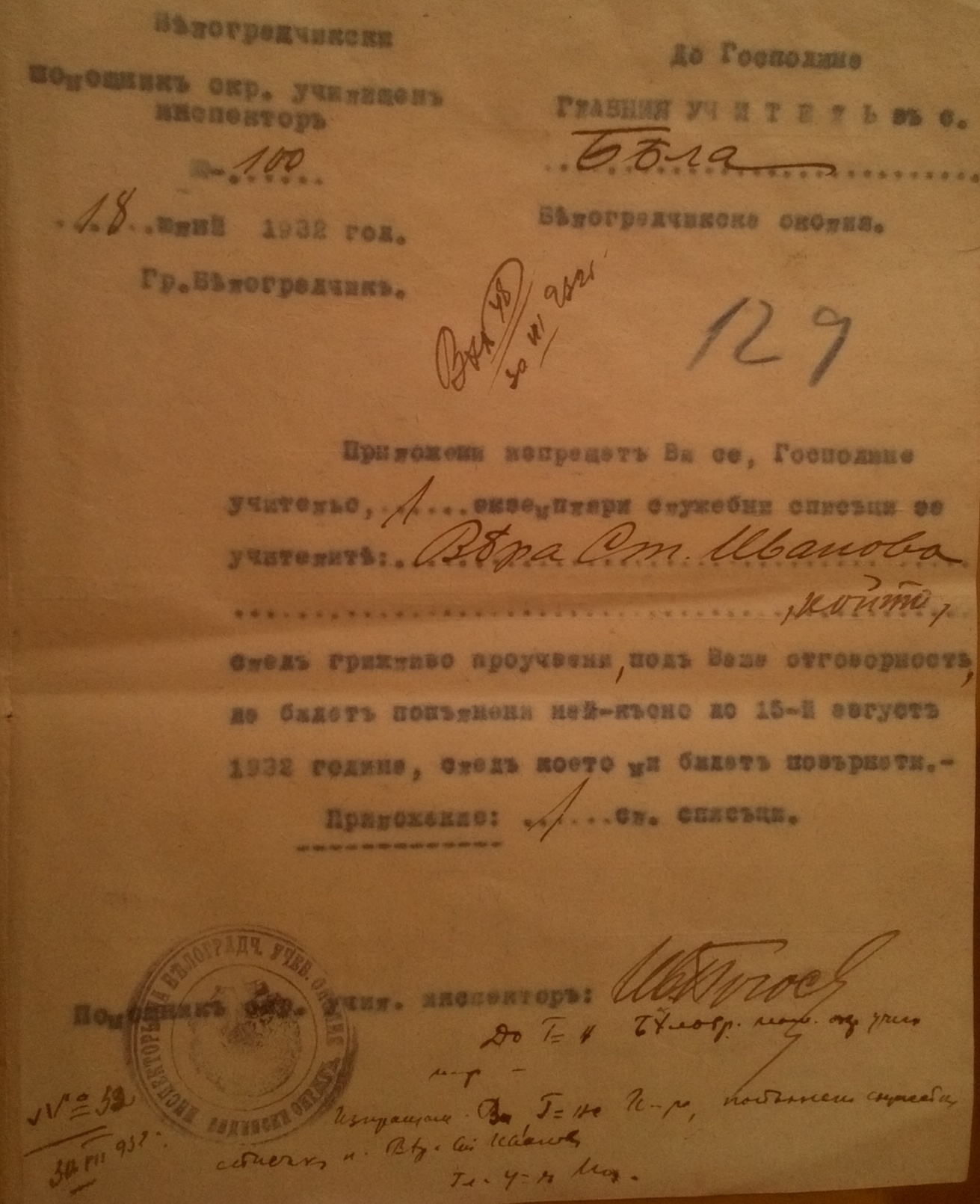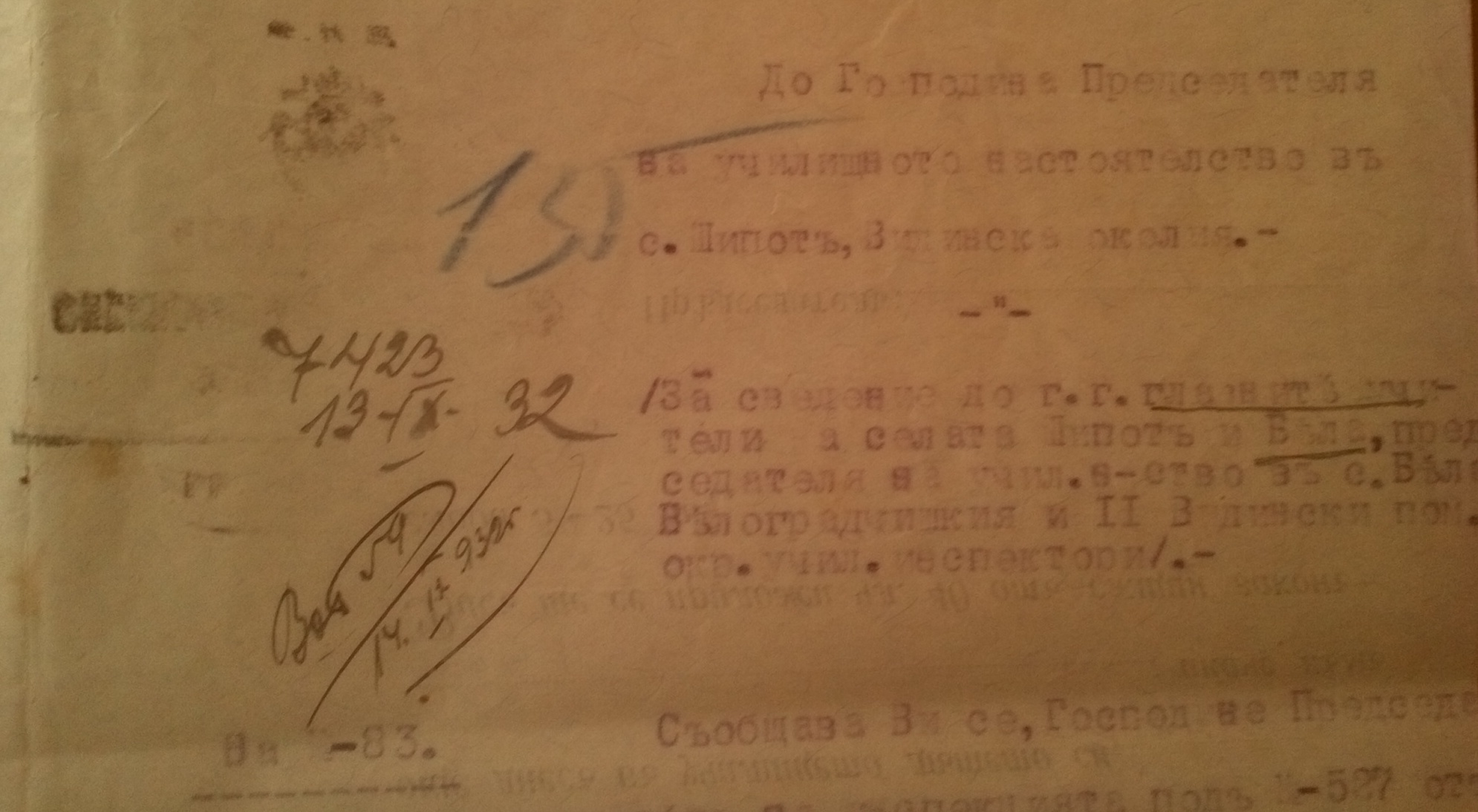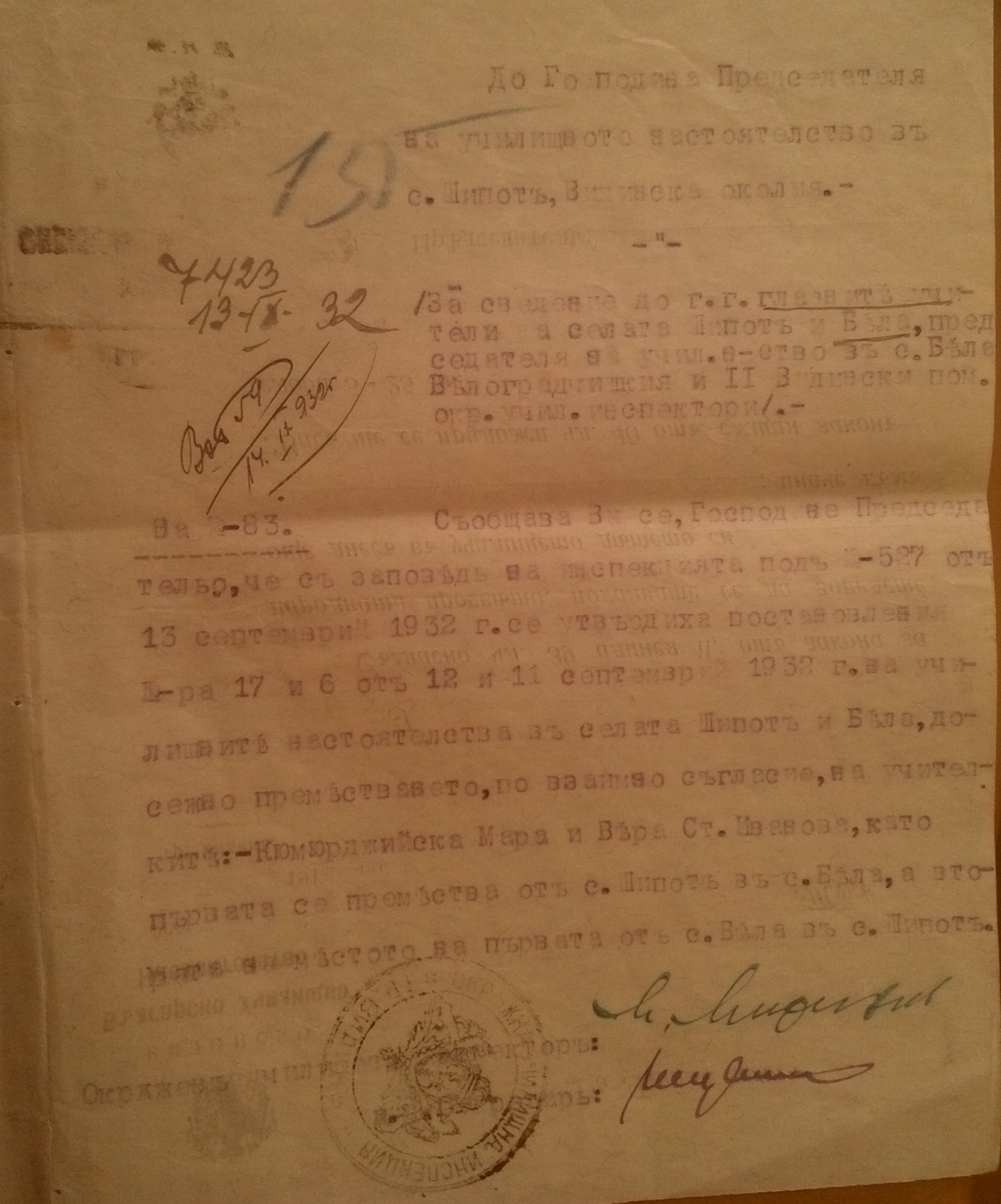 Съобщава ви се Господине Председательо, че със заповед на инспектората под N-527 от 09.13.1932 г. се утвърдиха постановления номера 17 и 6 от 11 и 12 Септемврий 1932 г. на училищните настоятелства в селата Шипот и Бела, относно преместването, по взаимно съгласие, на учителките: Кюмюрджийска Мара и Вера Ст. Иванова, като първата се премества от с.Шипот в с.Бела, а втората на мястото на първата от с.Бела в с.Шипот.