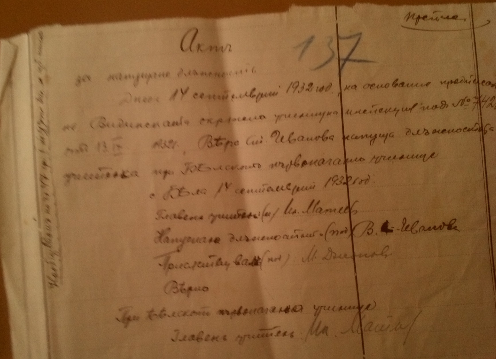 Встъпват в длъжност учителите: Мара Кюмюрджийска и Велко Аврамов, а напуска Вера Ст.Иванова. N7423 и N7377