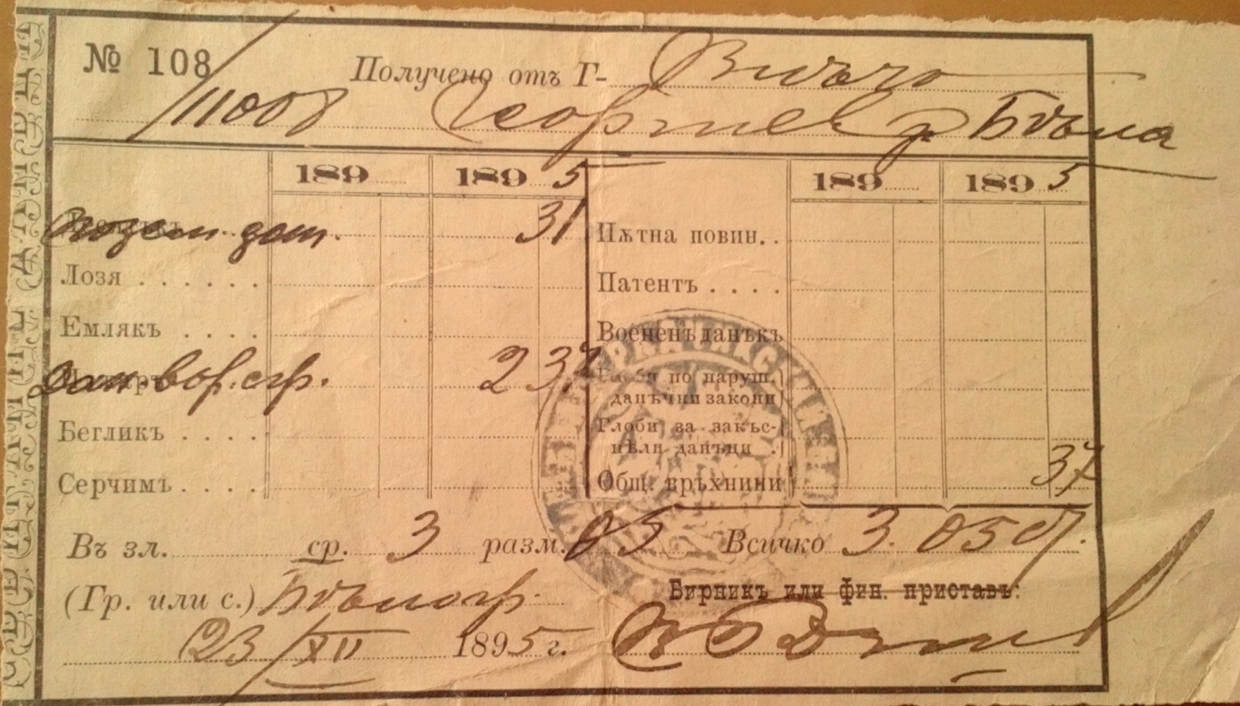 N 108 Получено от Влъчо 23.12.1895 год.