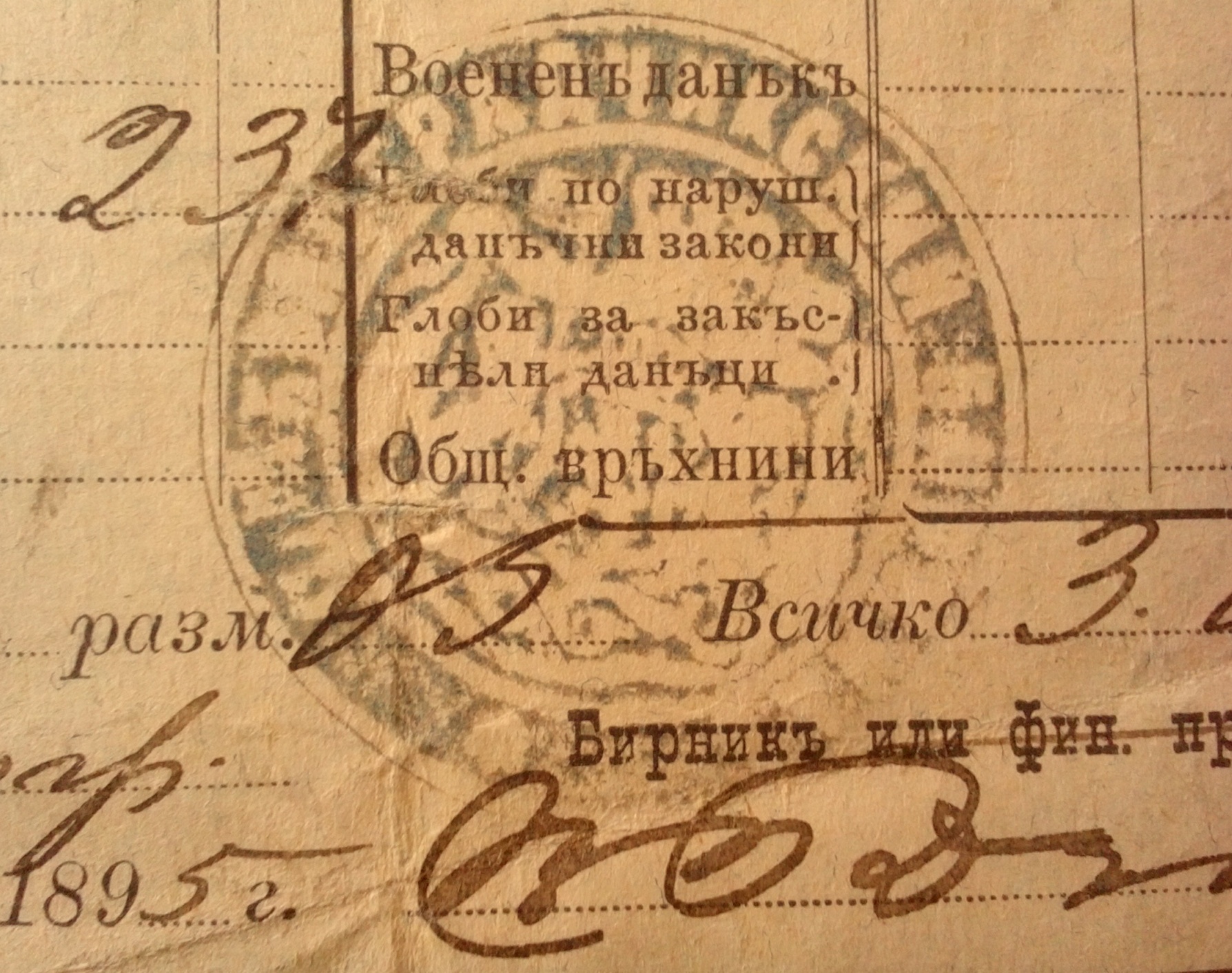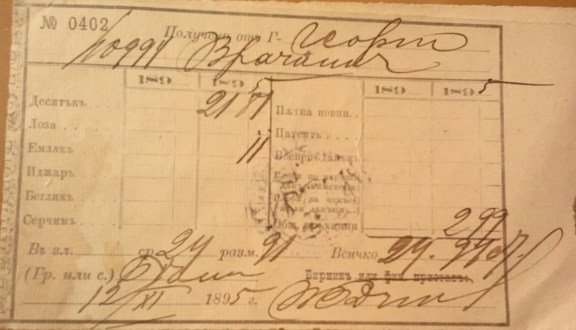 N 0401 Получено от Илия Пешов 12.11.1895 год.