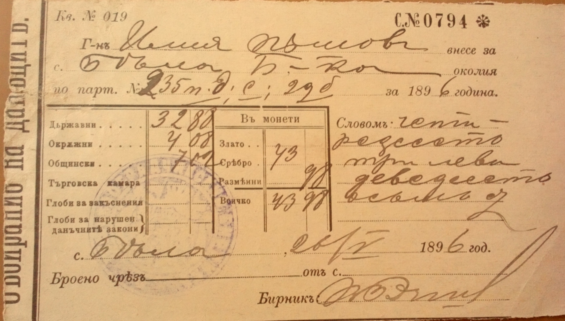 Събиране на Данъци N 019 , Г-н Илия Пешев внесе за 1896 година.