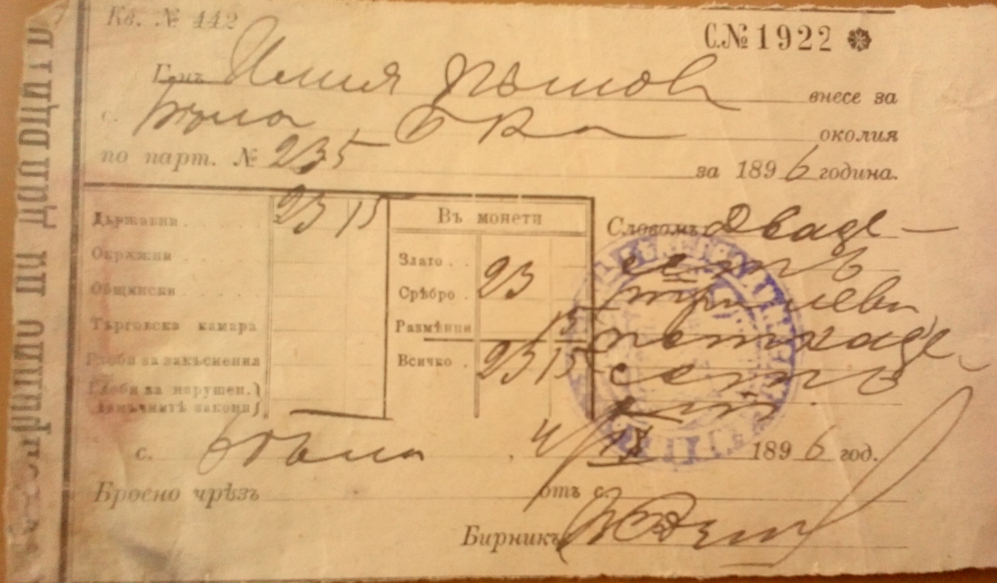 N 442 , Г-н Илия Пешов внесе за 1896 година по партиден номер 235.