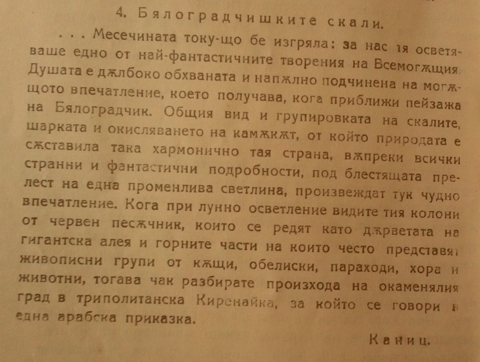 ……Месечината току-що бе изгряла: за нас тя осветяваше едно от най-фантастичните творения на Всемогъщия, Душата е дълбоко обхваната и напълно подчинена на могъщото впечатление, което получава, кога приближи пейзажа на Белоградчик. Общият вид и групировката на скалите, шарката на камъка, от който природата е съставила така хармонично този край, въпреки всички странни и фантастични подробности под блестящата прелест на една променлива светлина, произвежда тук чудно впечатление. когато при лунно осветление видите тези колони от червен пясъчник, които се редят като дърветата на гигантска алея и горните части на които често представляват групи от къщи, паметници, параходи, хора и животни, тогава чак разбирате произхода на окаменелия град в Триполитанска Киринейка, за който се говори в една арабска приказка….