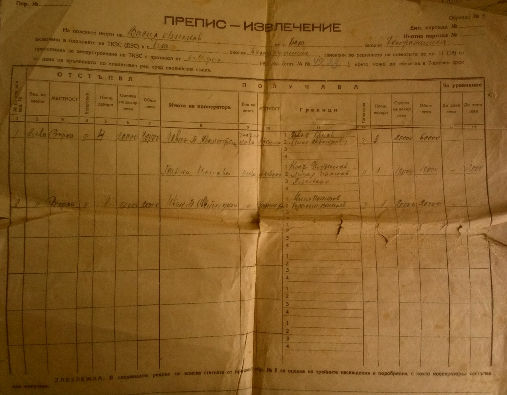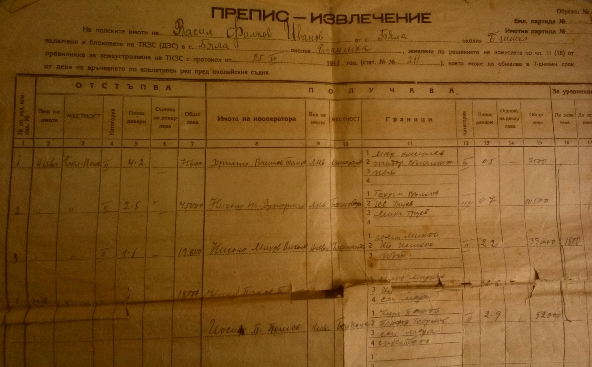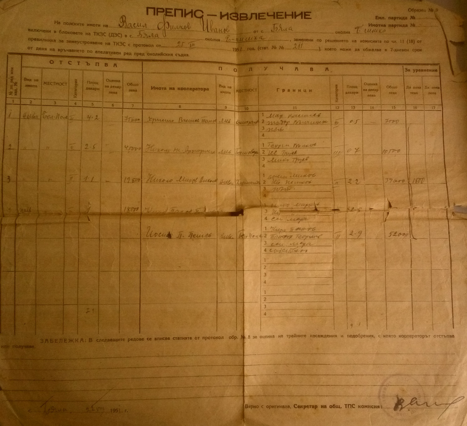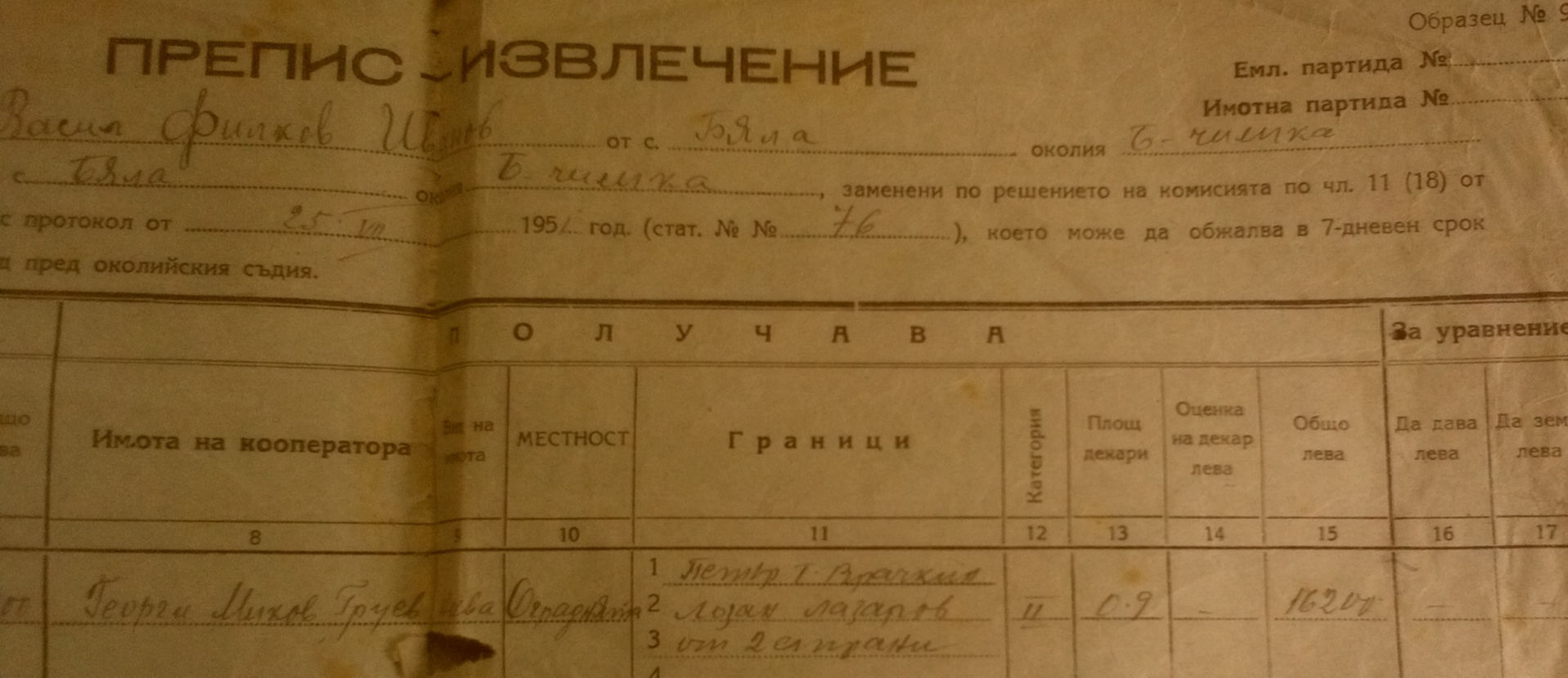Документите са дадени на Васил Филков Иванов от село Бела и представляват ПРЕПИС – ИЗВЛЕЧЕНИЕ на полски имоти,които се взимат от него т.е. той ги отстъпва на членове на ТКЗС – то, а на него му се дават други имоти, т.е. заменят му се сдруги имоти.