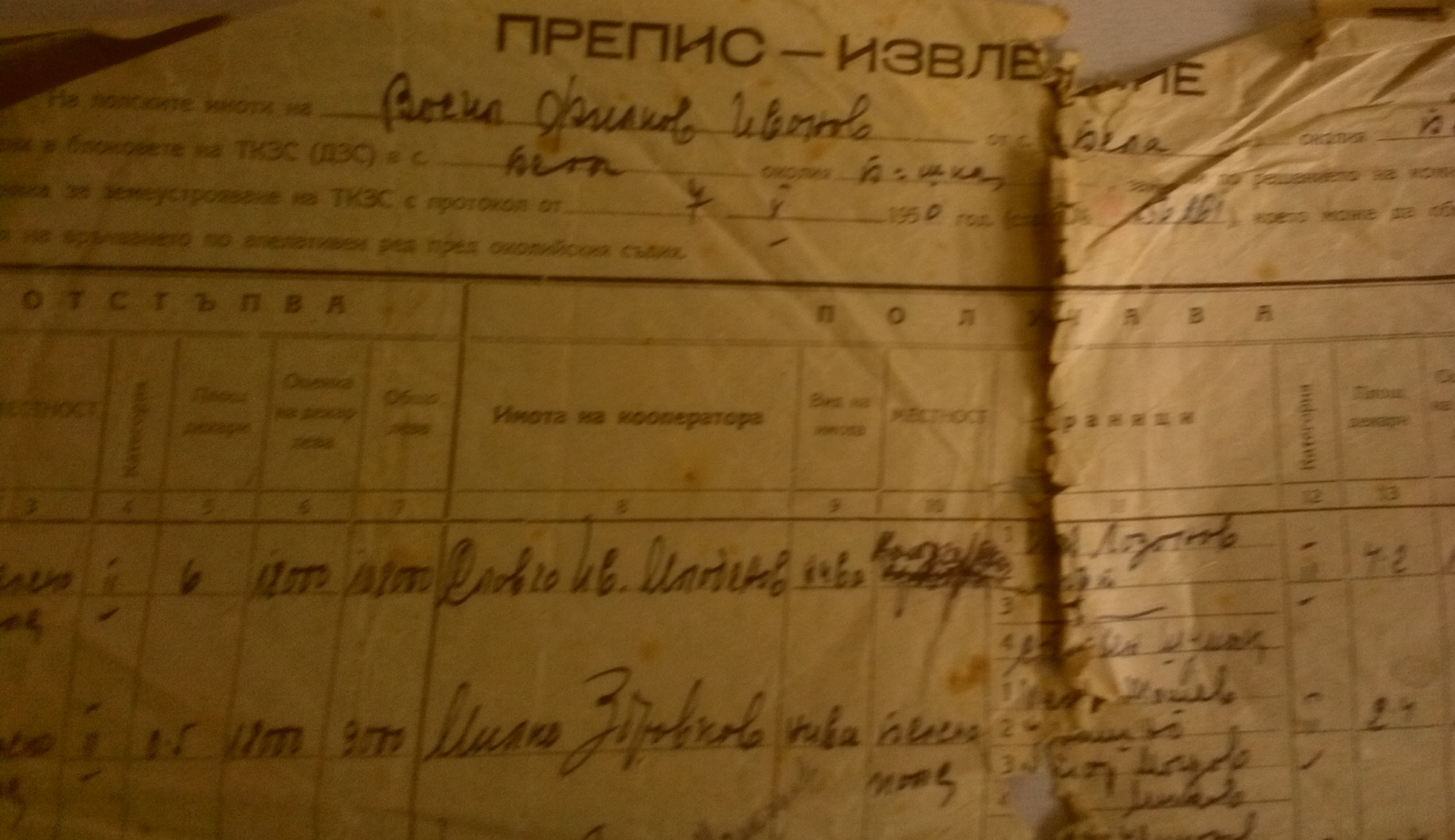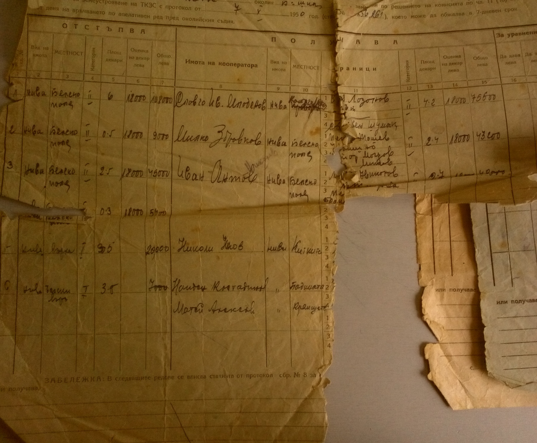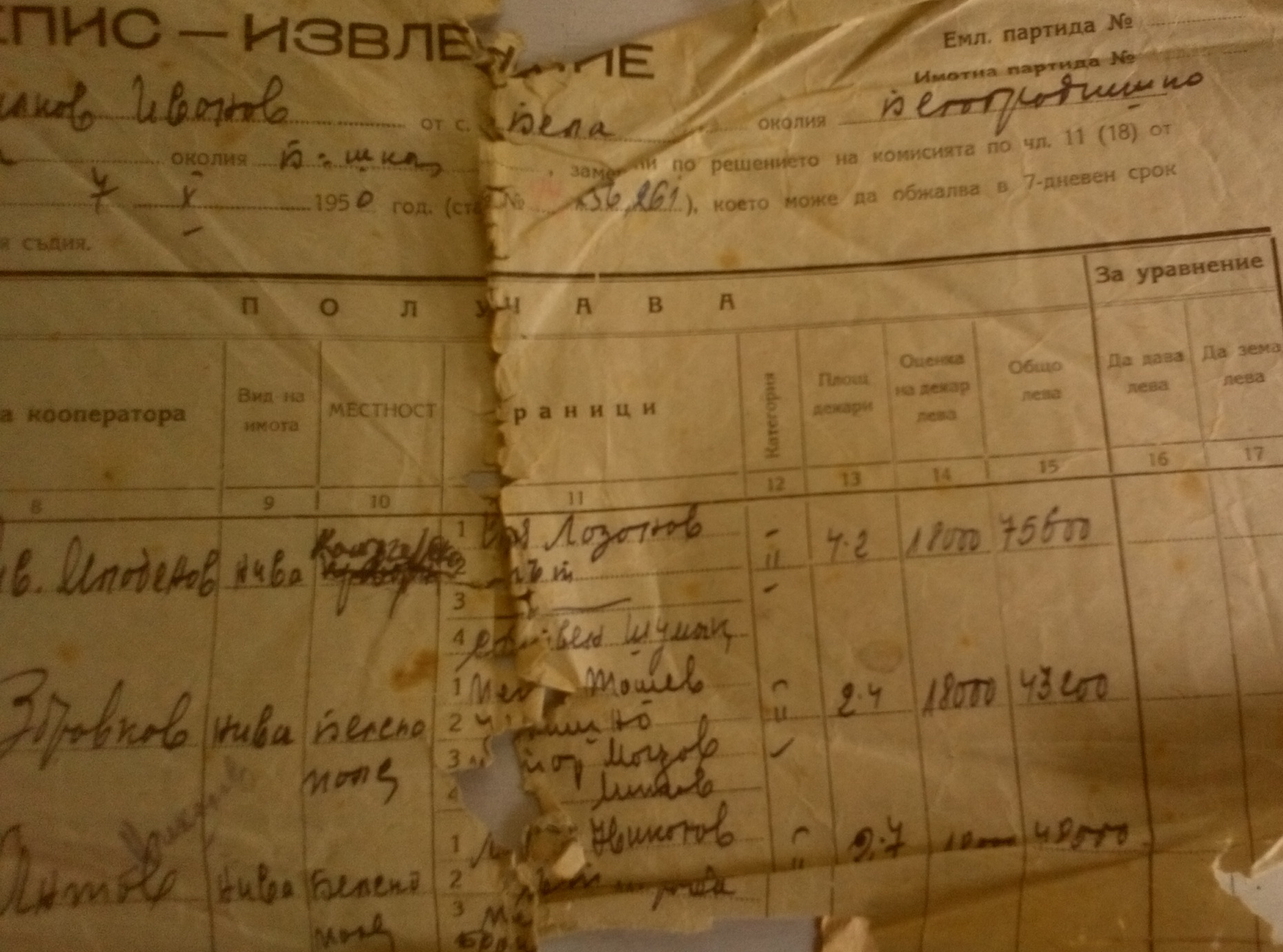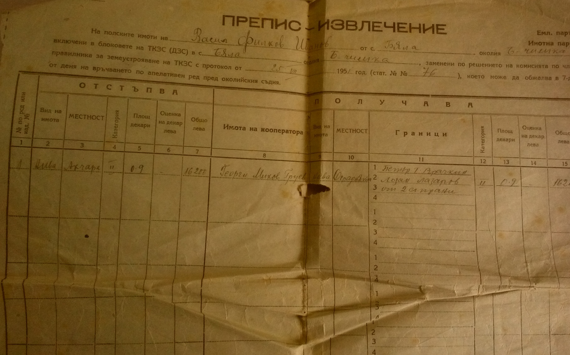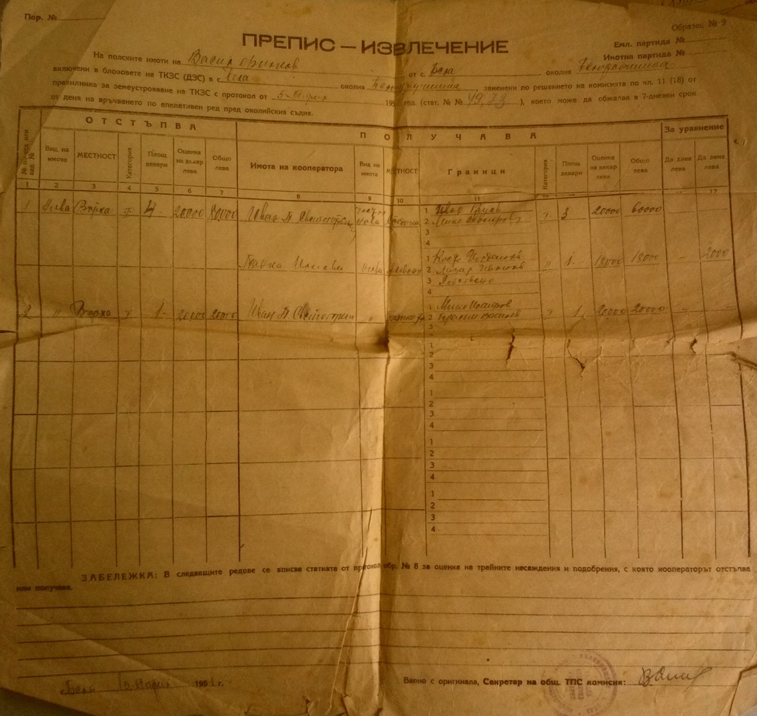 Документите са дадени на Васил Филков Иванов от село Бела и представляват ПРЕПИС – ИЗВЛЕЧЕНИЕ на полски имоти,които се взимат от него т.е. той ги отстъпва на членове на ТКЗС – то, а на него му се дават други имоти, т.е. заменят му се сдруги имоти.