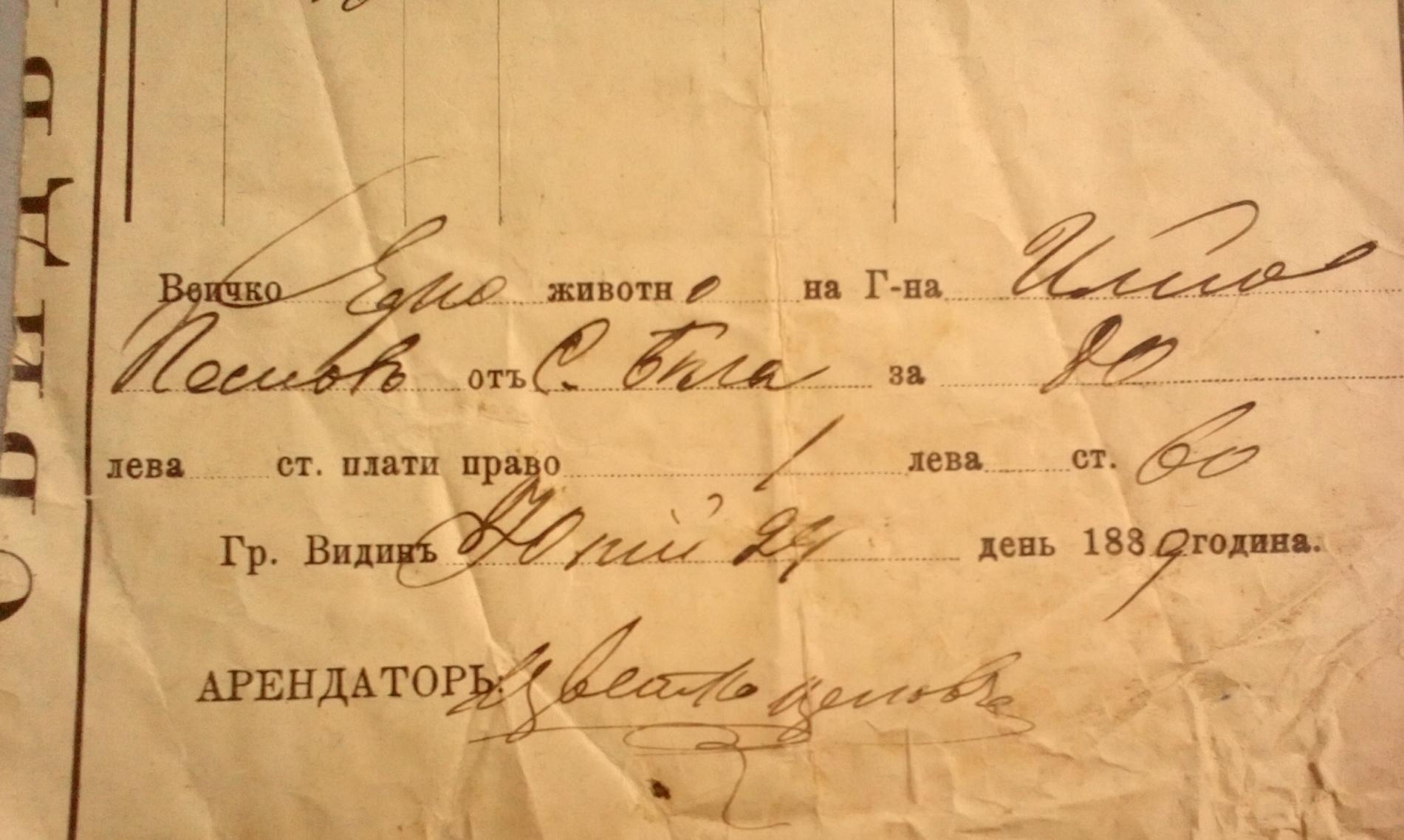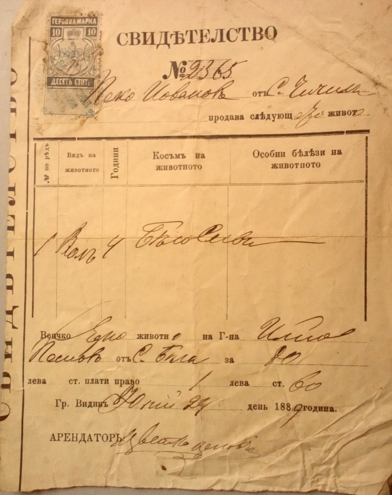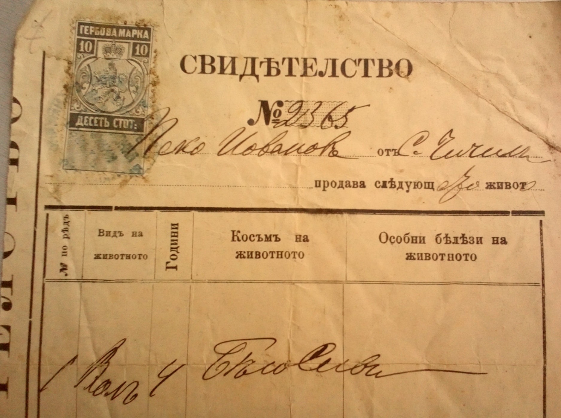 Свидетелство N 2365, Пеко Йованов от с.Чичил продава един ВОЛ, Белосив на Илио Пешов от с.Бела.
