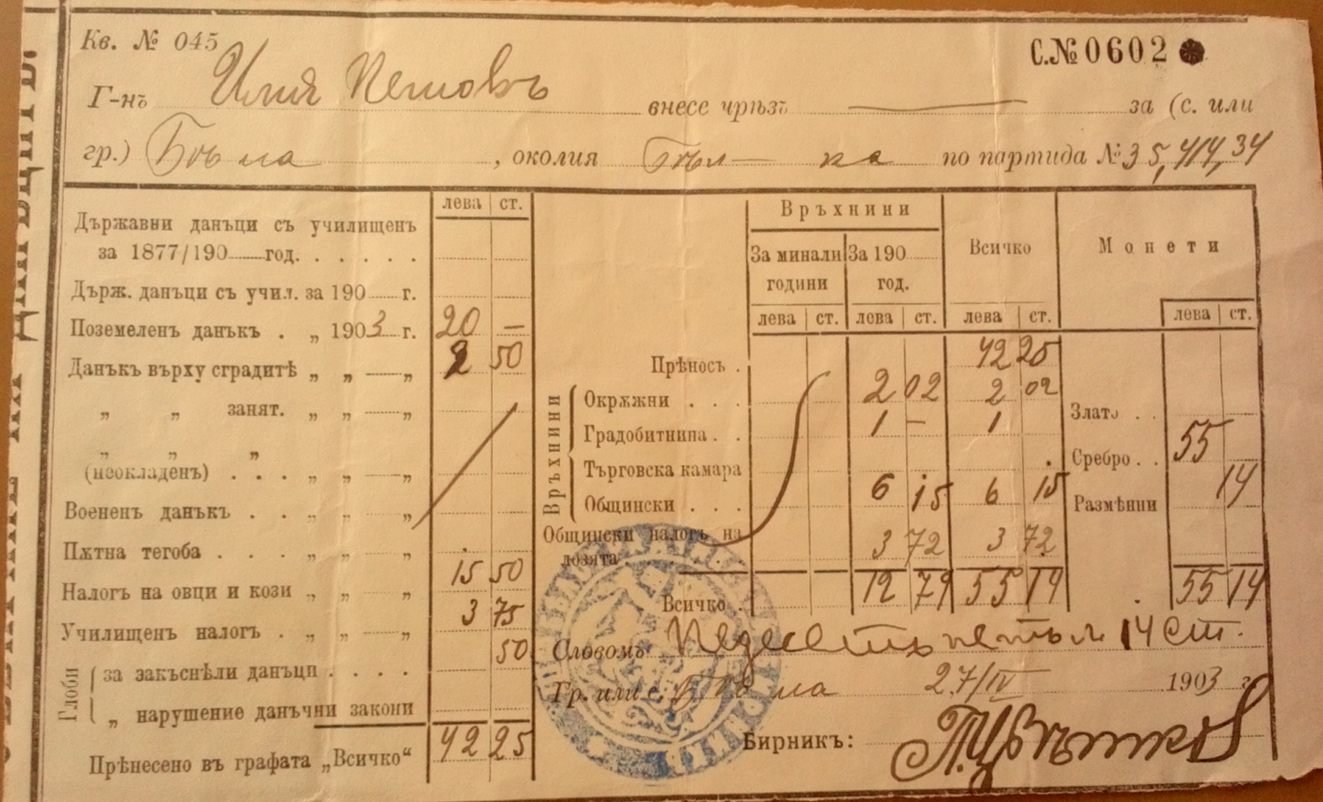 N 043, парт. 35;414;34, 27.04.1903 год., с.Бела