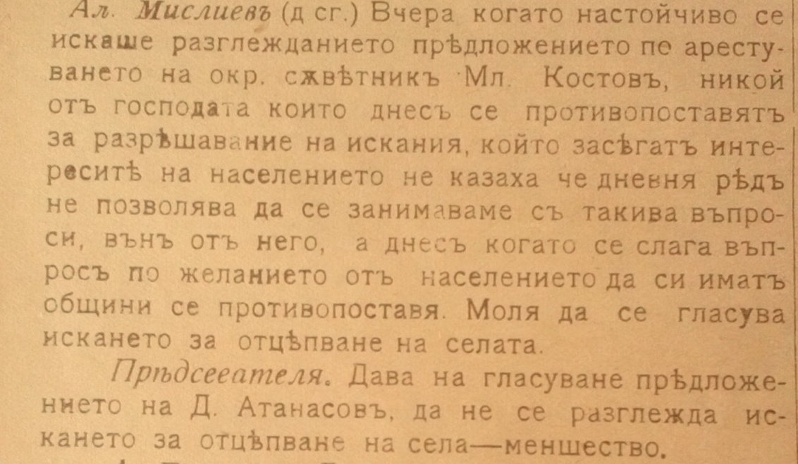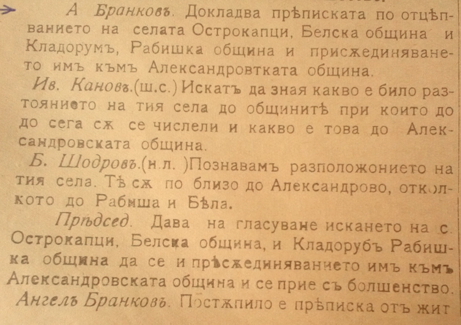 Докладва преписка по отцепване на селата Острокапци, Белска община и Кладоруб, Рабишка община и присъединяването им към Александровската община.