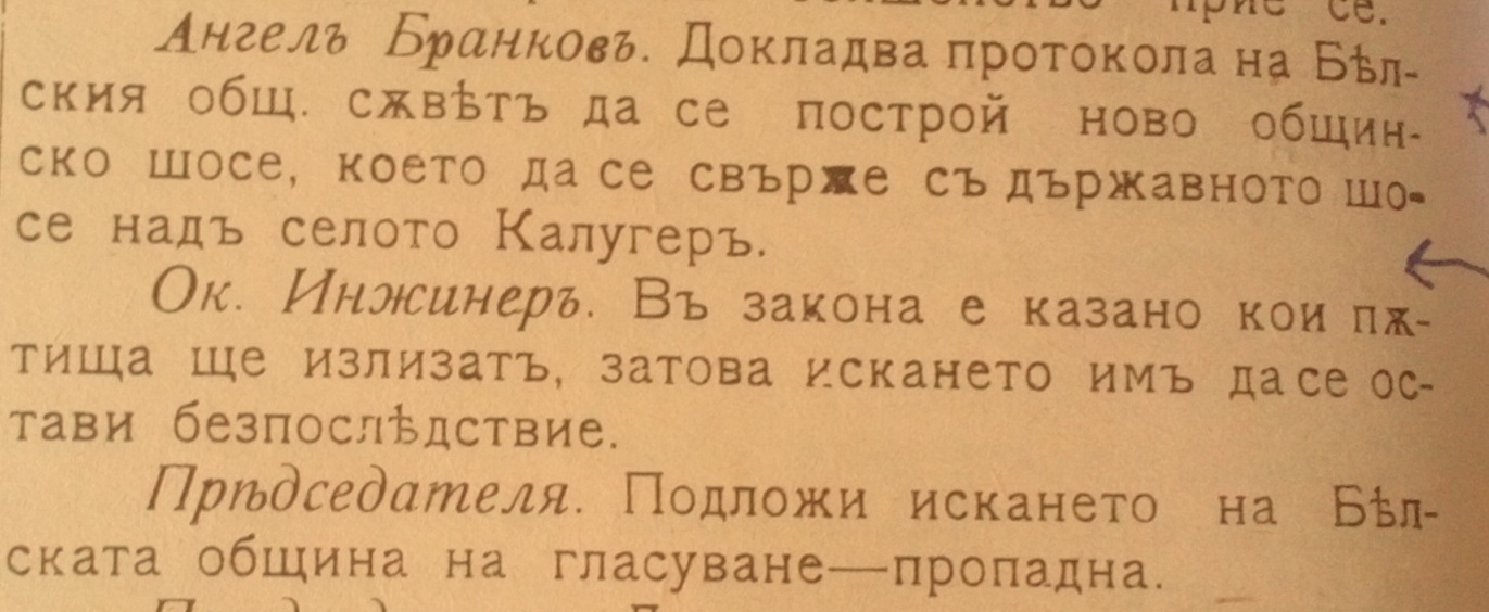 Докладва протокола на Белския Общински съвет да се построи ново общинско шосе, което да се свърже с държавното шосе над село Калугер.