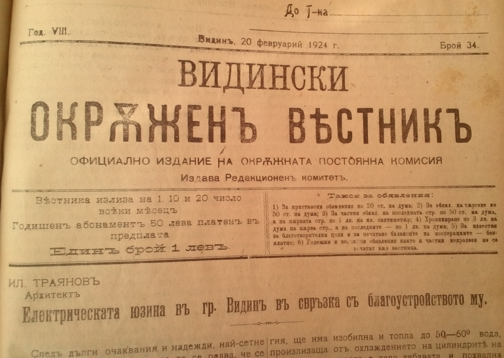 След дълги очаквания и надежди, най-сетне Видинското гражданство може да се радва, че се постига една от задачите на по благоустрояване на гр.Видин – електрическото осветление. И наистина, времето е настъпило отдавна!