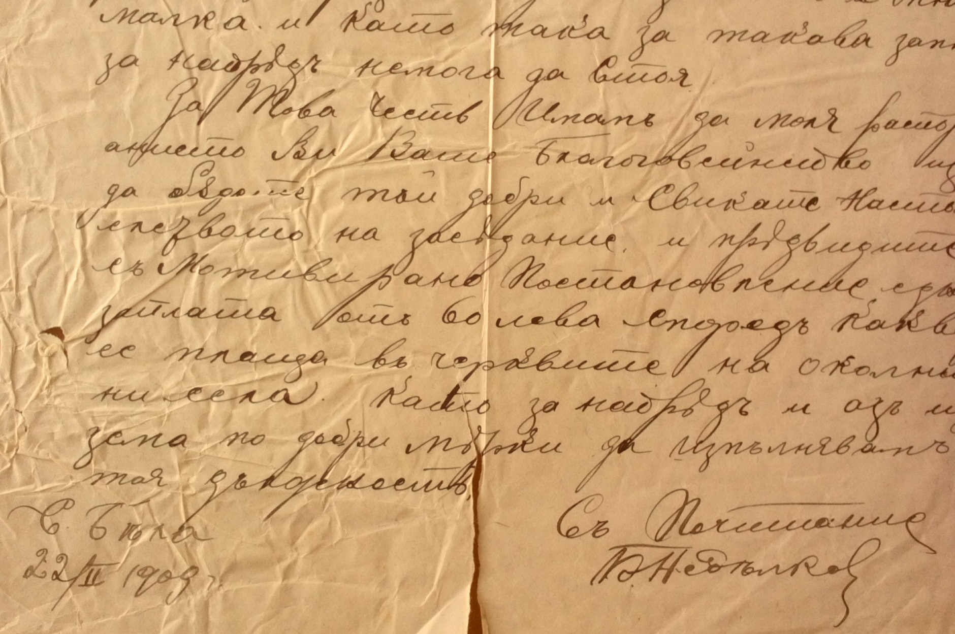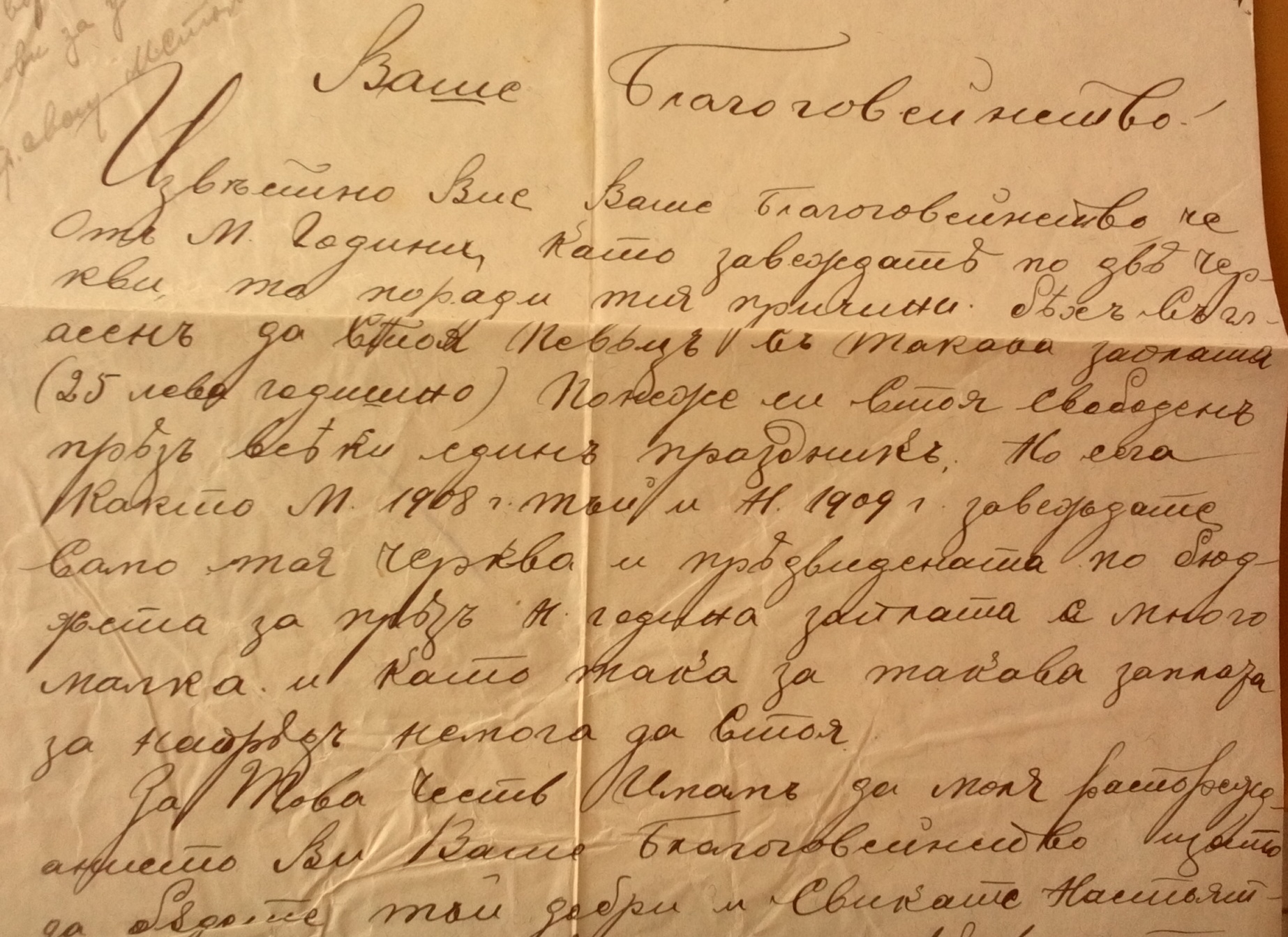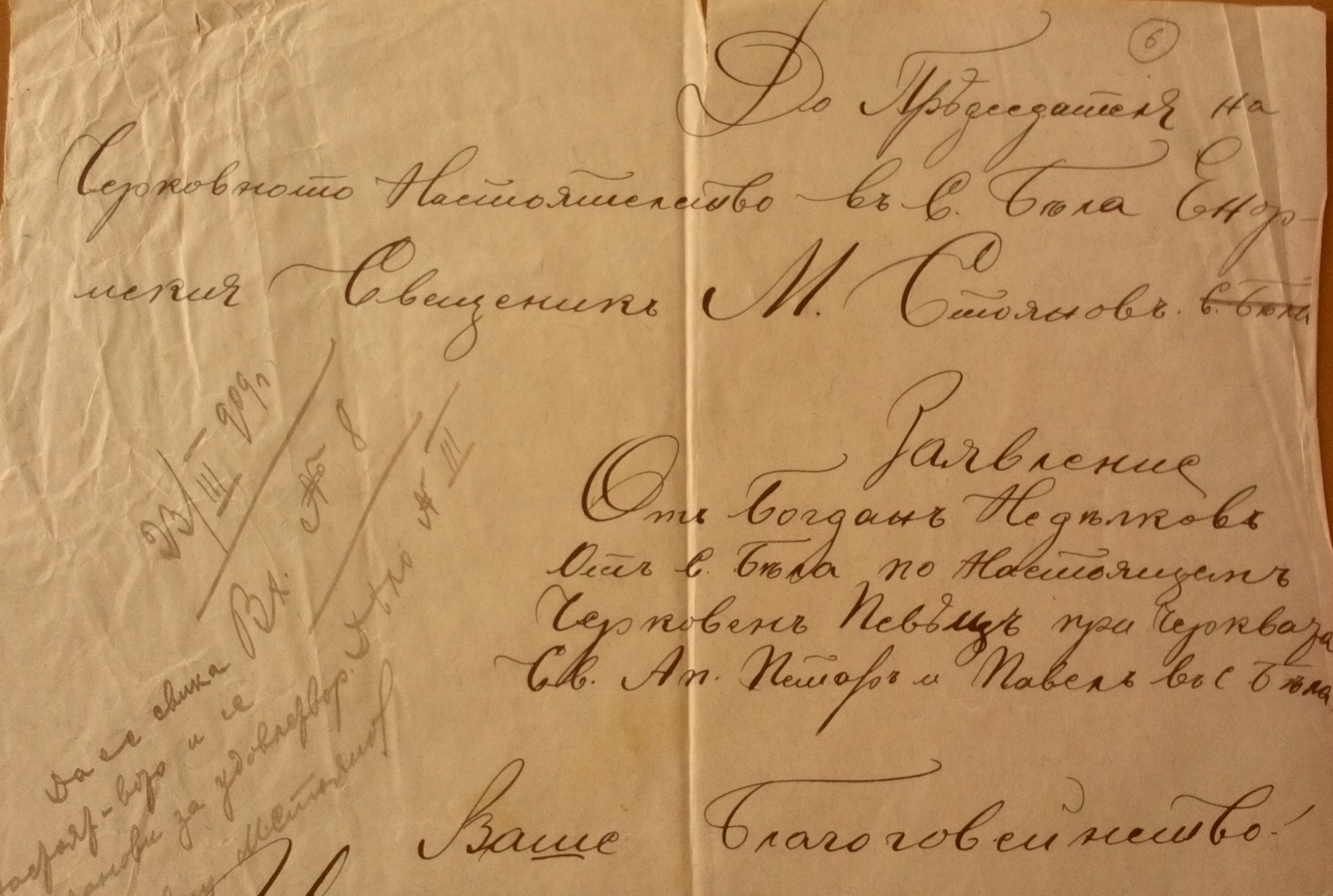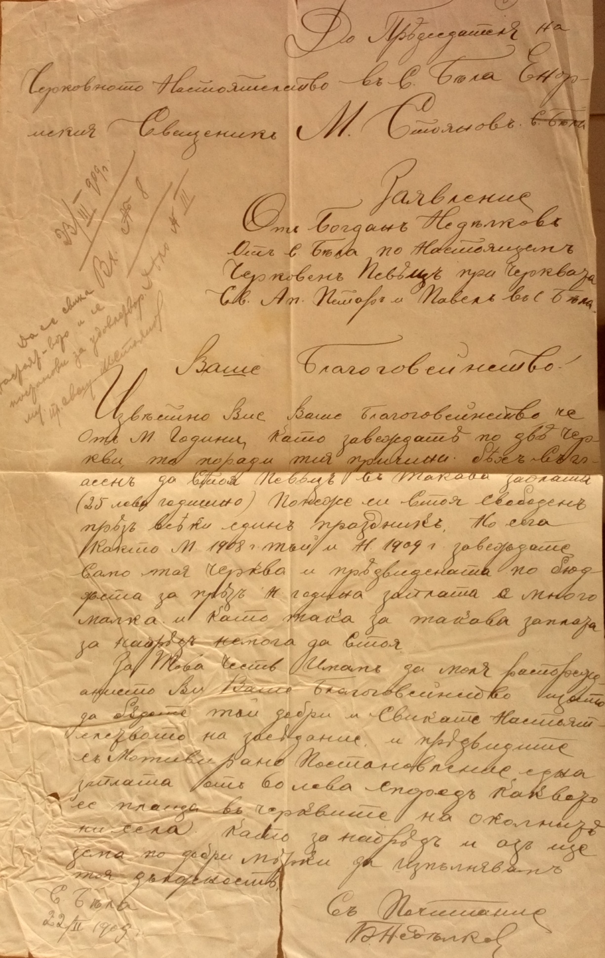 Заявление от Богдан Недялков от село Бела по настоящем Черковен певец при черквата Св.Ап.Петър и Павел в с.Бела