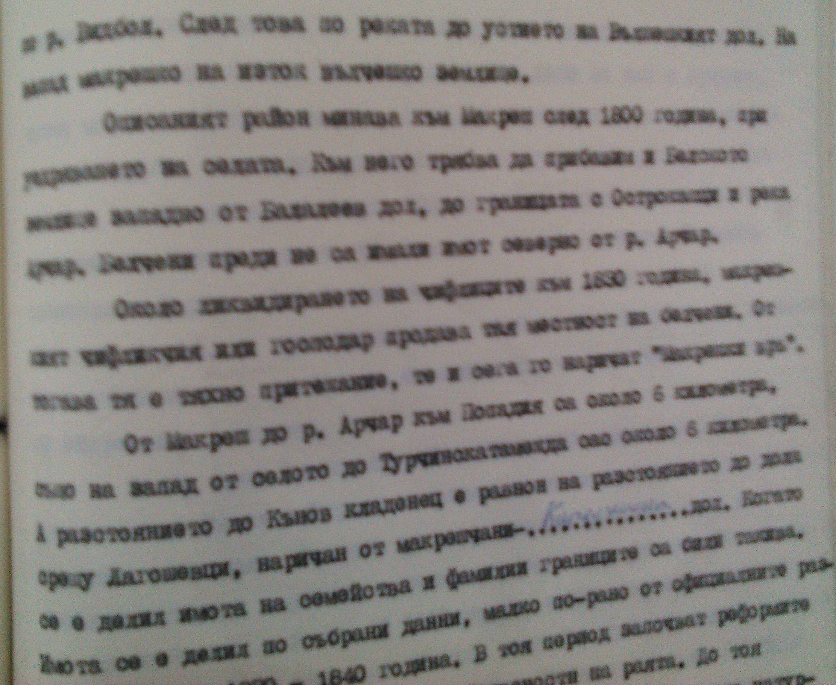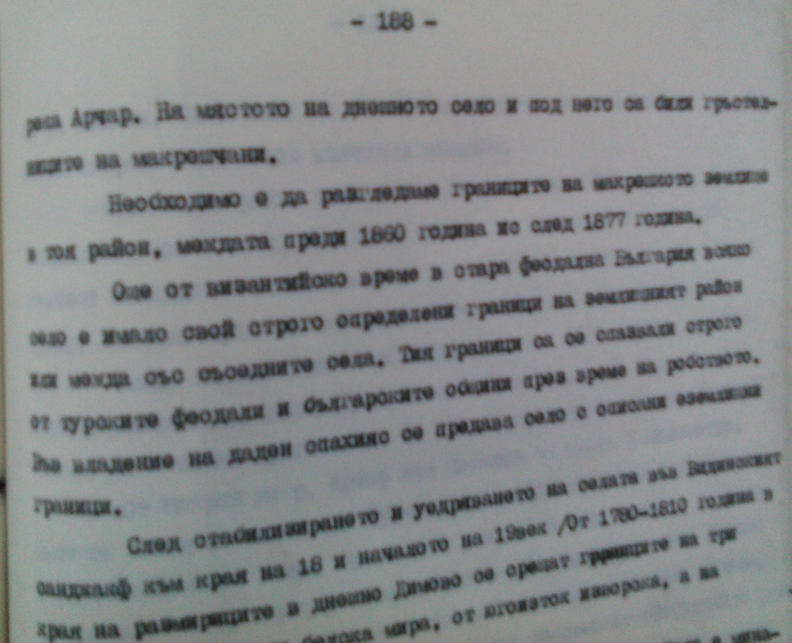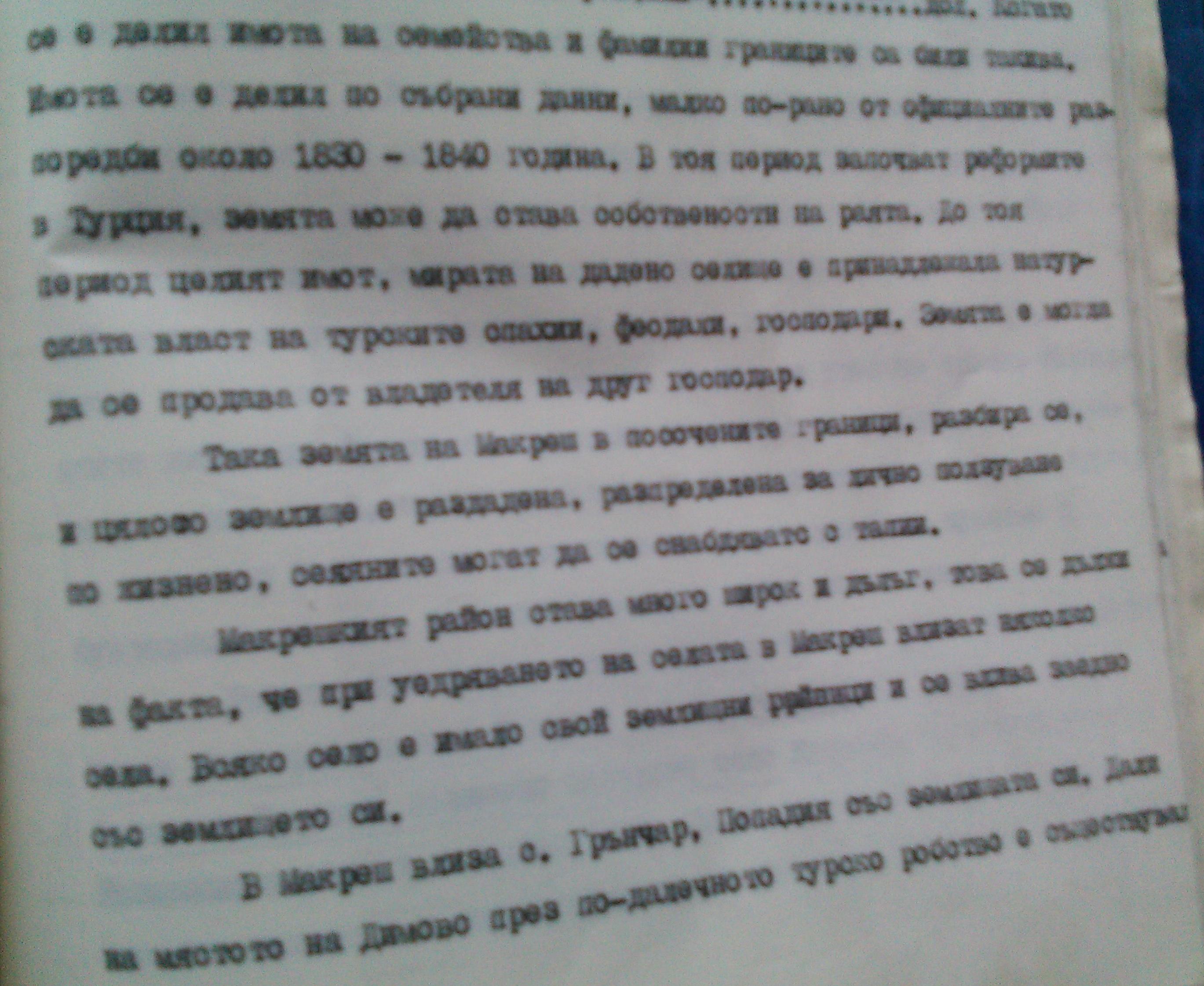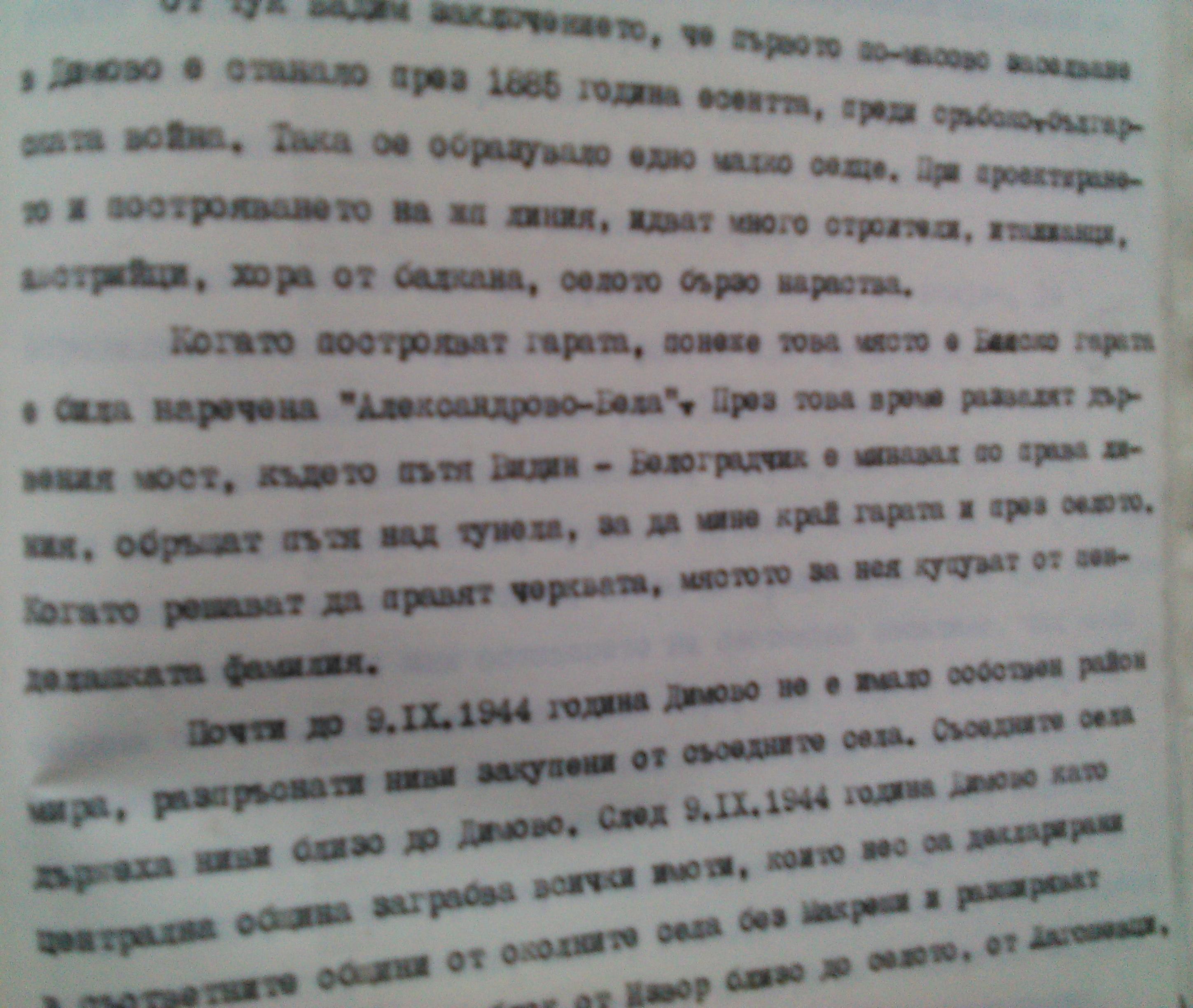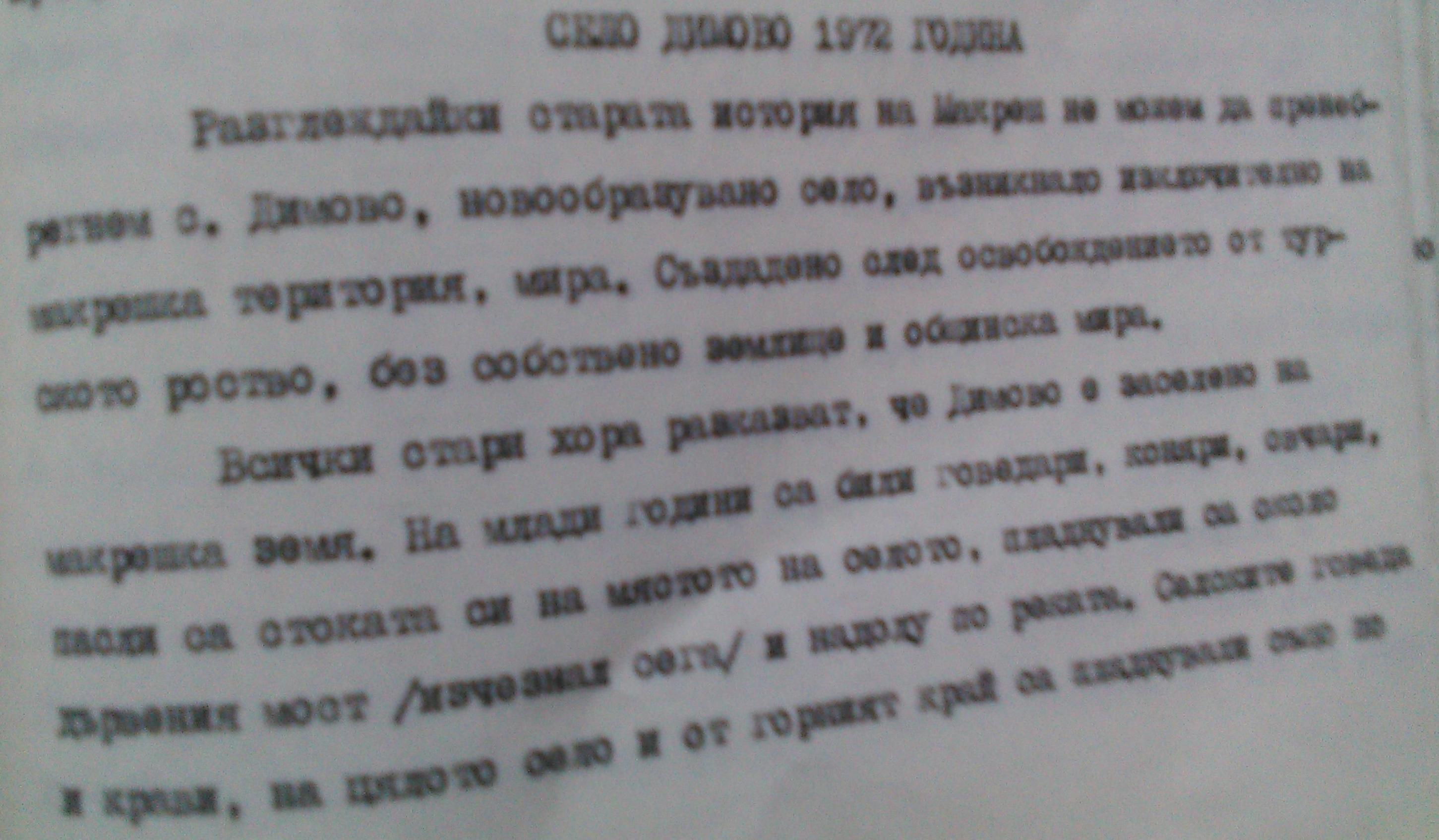 „Разглеждайки старата история на село Макреш не можем да пренебрегнем с.Димово, новообразувано село, възникнало изключително на Макрешка територия, мера. Създадено след освобождението от турско робство, без сбствено землище и общинска мера….“
