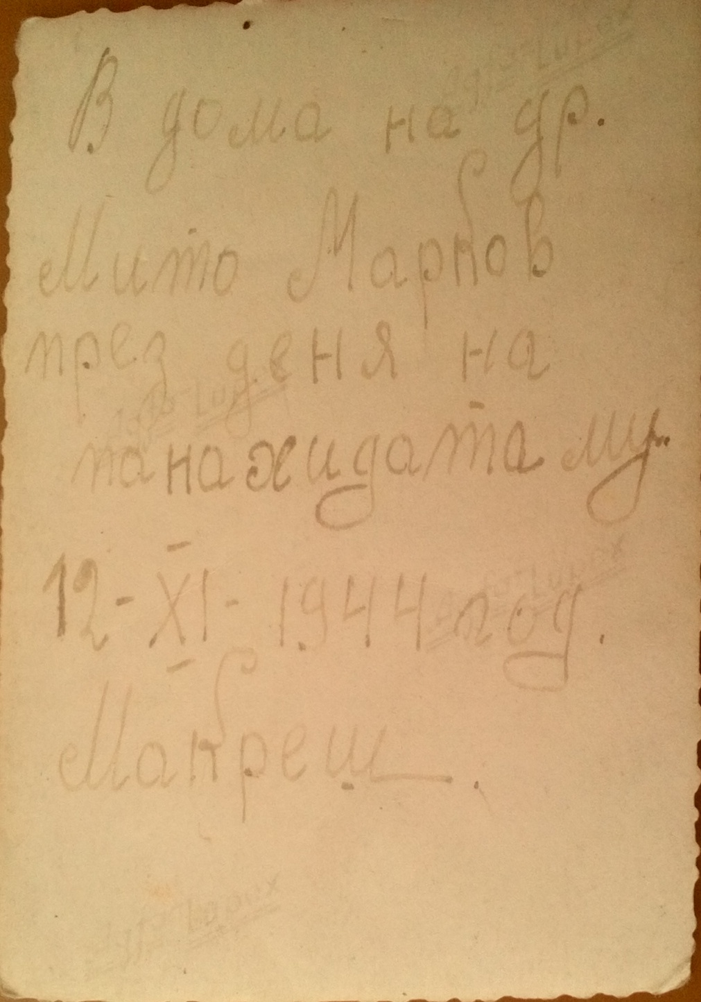 Надпис: В дома на др.Мито Марков през деня на панахидта му.