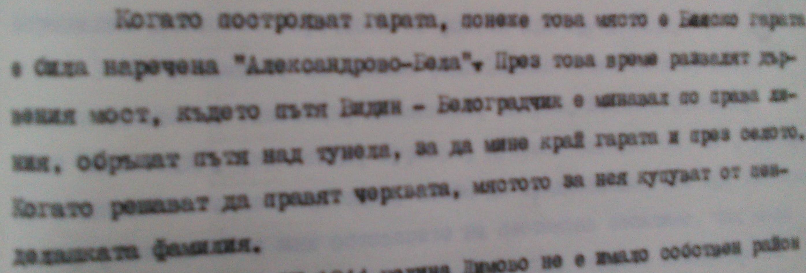Когато построяват гарата, понеже това място е Белско гарата е била наречена „Александрово – Бела“ . През това време развалят дървения мост, където пътя Видин-Белоградчик е минавал по права линия, обръщат пътя над тунела, за да минава край гарата и през селото. Когато решават да правят черквата, мястото за нея купуват от пенделашката фамилия.