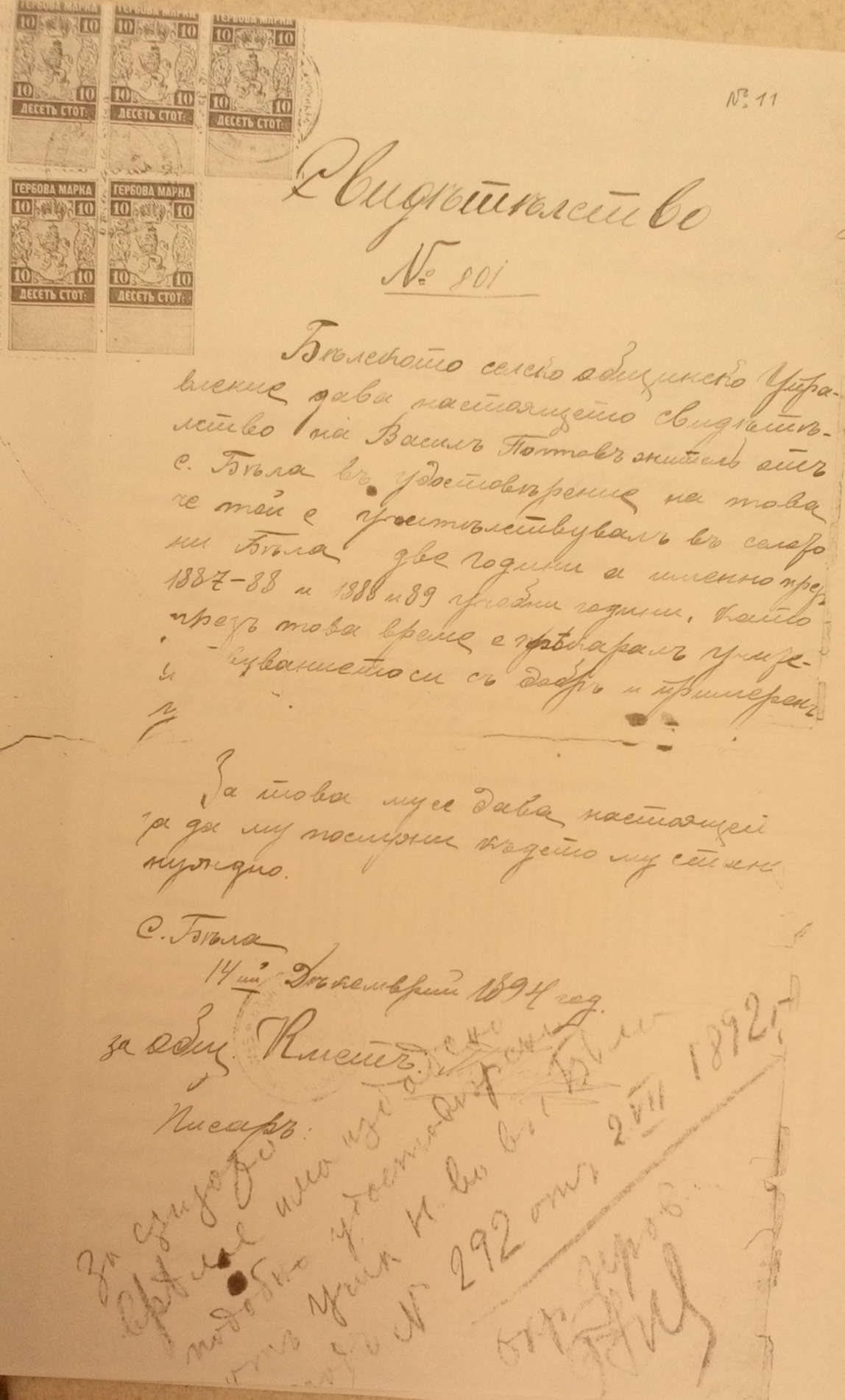 Белското Селско Общинско Управление дава настоящето свидетелство на Васил Попов Живков от село Бела в удостоверение на това, че той е учителствувал в селото ни Бела 1887/8 и 1888/9 година, като през това време е прекарал учителствуването си с добър и примерен успех.