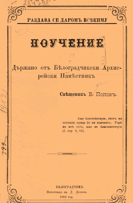 Книгата е „Поучение, държано от Белоградчишкия архиерейски наместник свещеник В. Попов“. Издадена през 1902 год. в печатницата на Д. Донов.