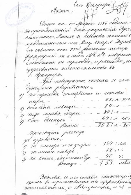 Днес 13 Март 1883 година Долуподписаний Архиерейски Белоградчишки Наместник, Васил п.Иванов съгласно с предписанието на Вид.Епархийски Духовен съвет от 28 ми миналий месец Февруари тази година под N 182 проврих сметките по прихода и разхода на църковното настоярелство в с.Калугер…….