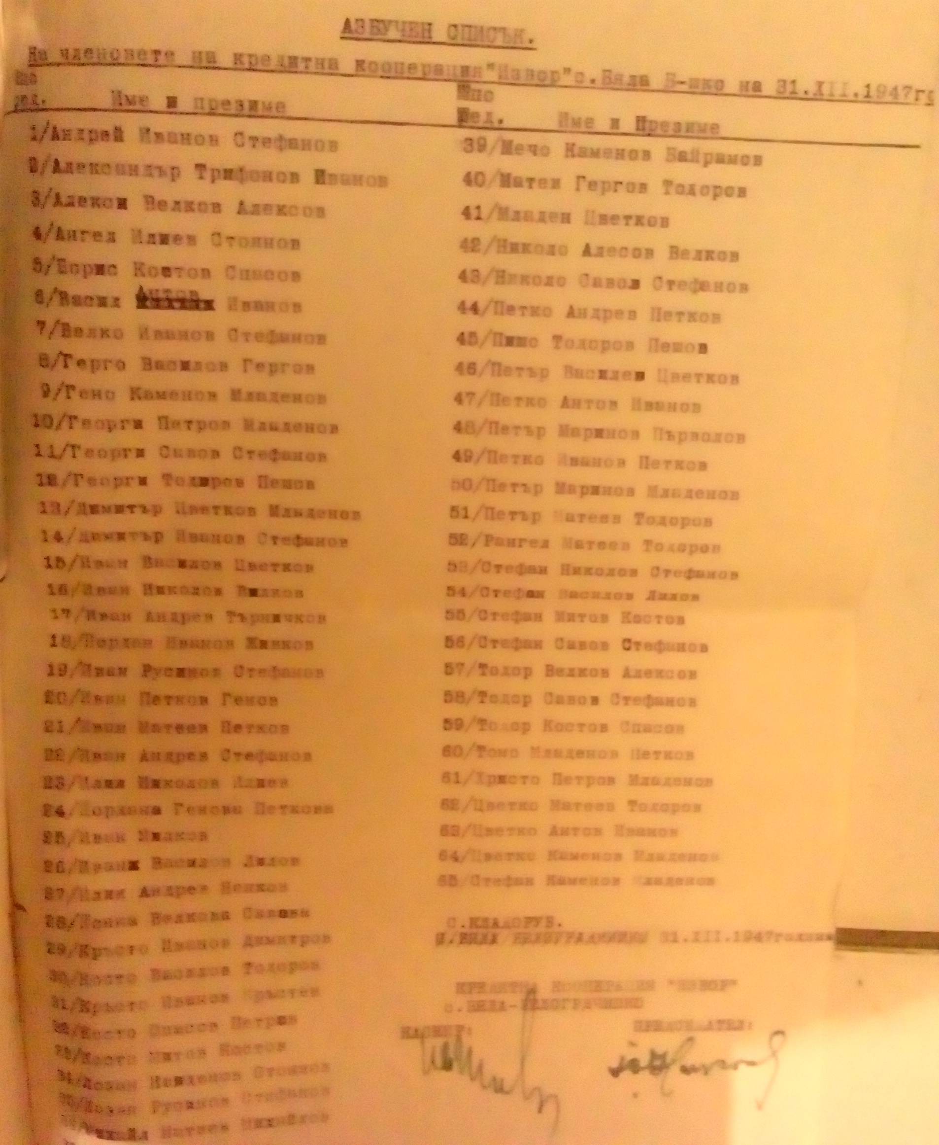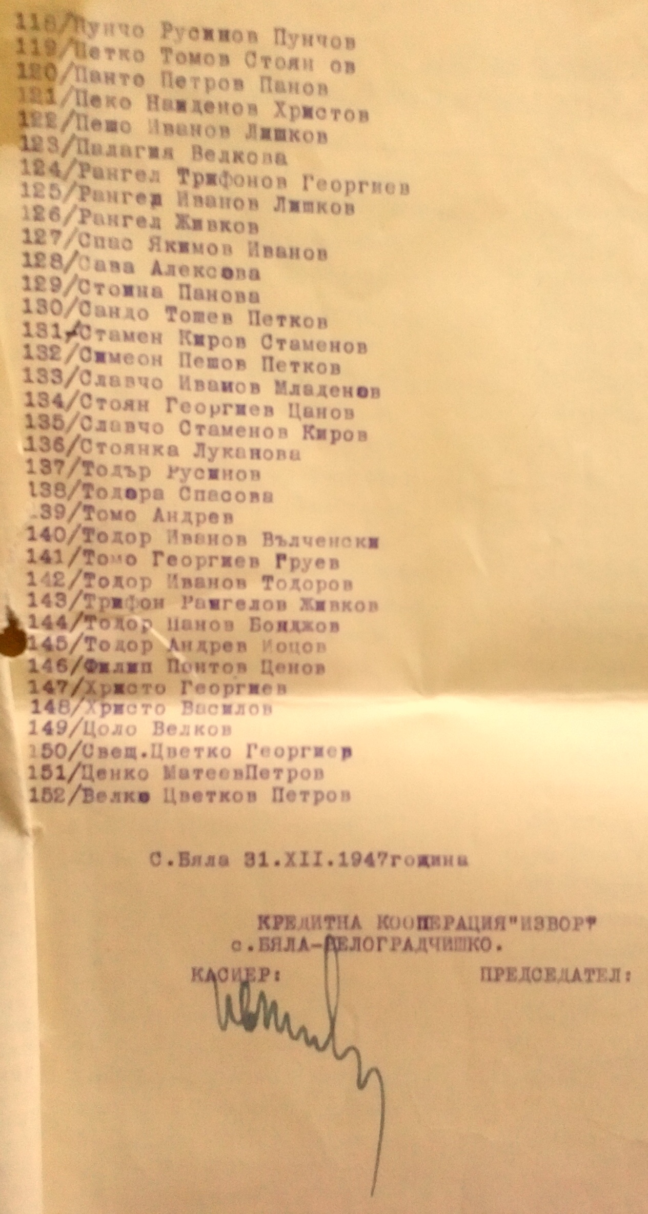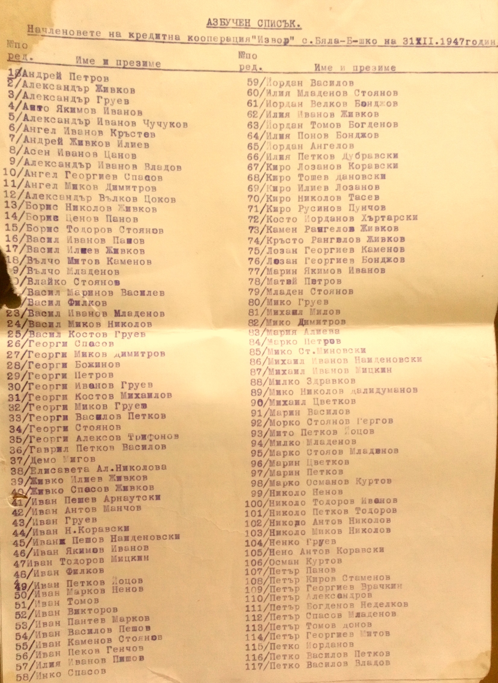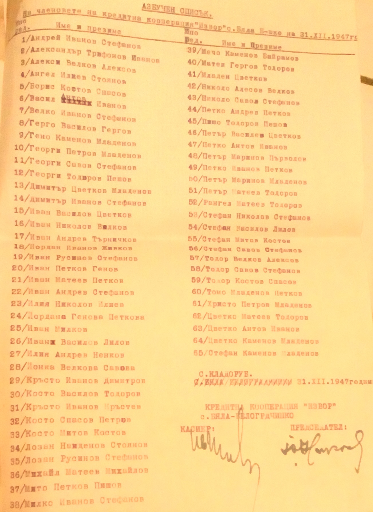 Азбучен Списък на членовете на кредитна кооперация „ИЗВОР” село Бела, Белоградчишко на 31.12.1947 год.