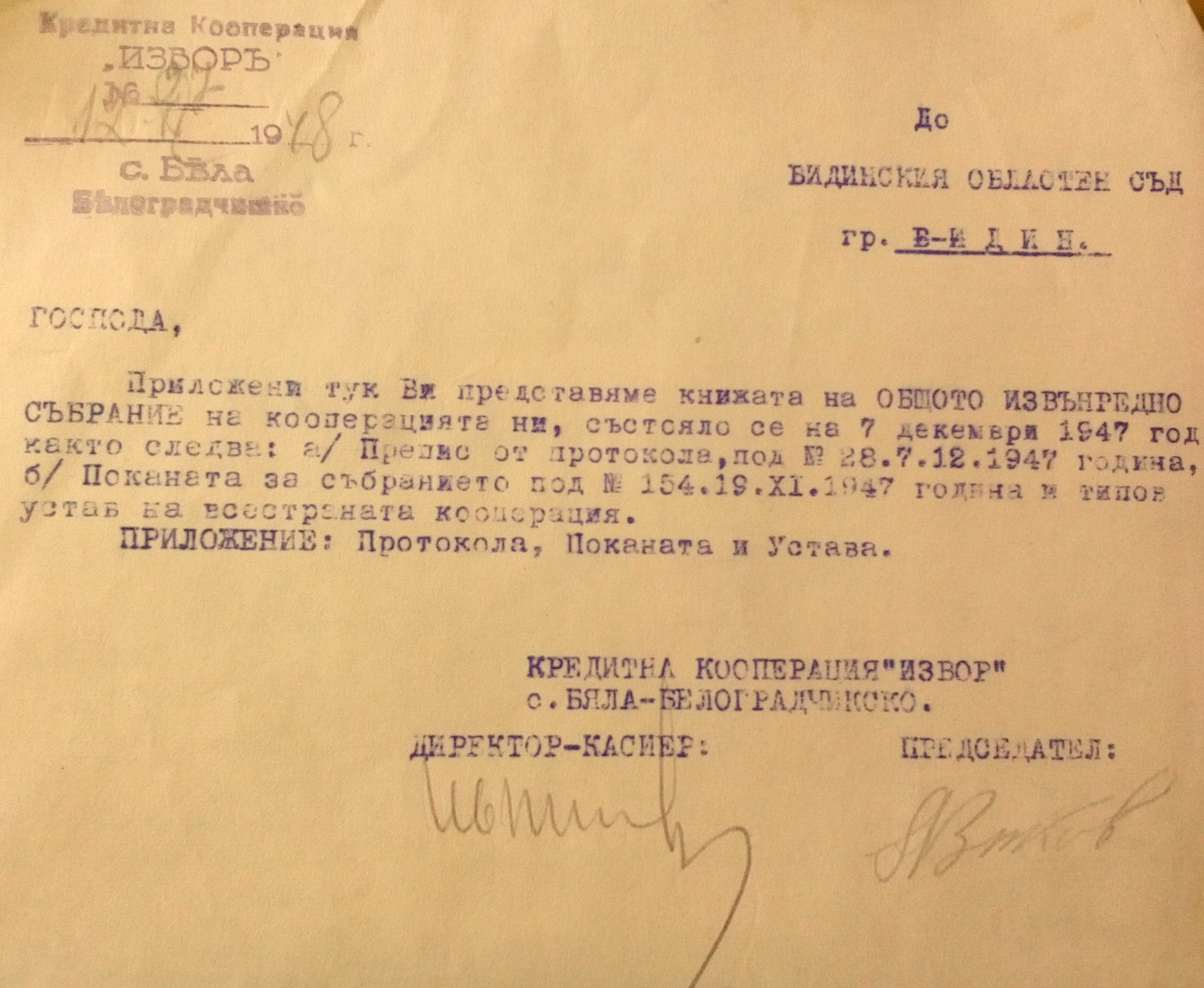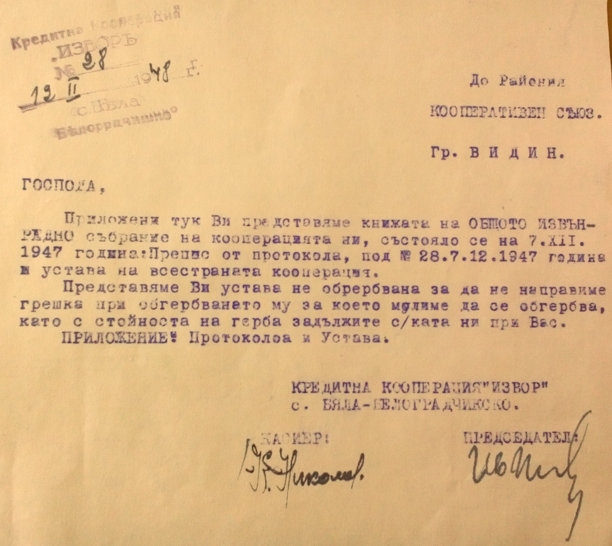 Приложени тук ви представяме книжата на Общото Извънредно Събрание на кооперацията ни, състояло се на 7 Декември 1947 год. както следва: а / Препис от протокол, под N 28 / 12.07.1947 год, б / Поканата за събранието под N 154 / 11.19.1947 год.. и типов устав на Всестранната кооперация.