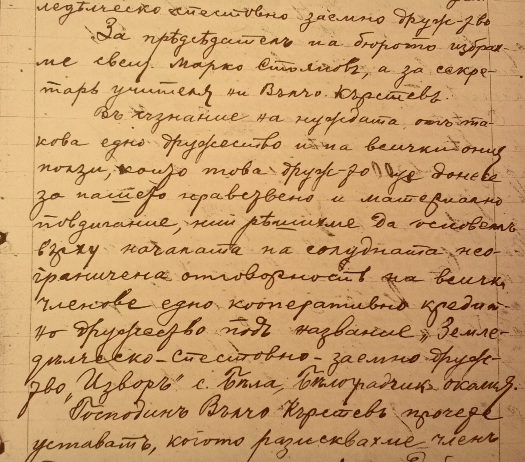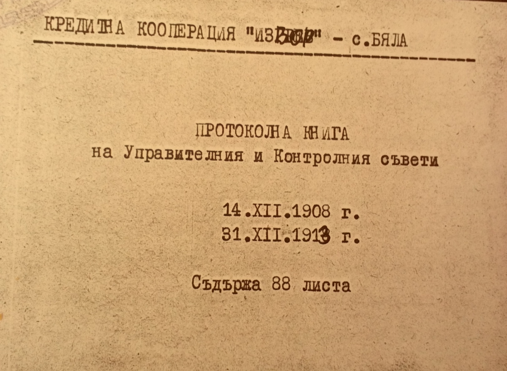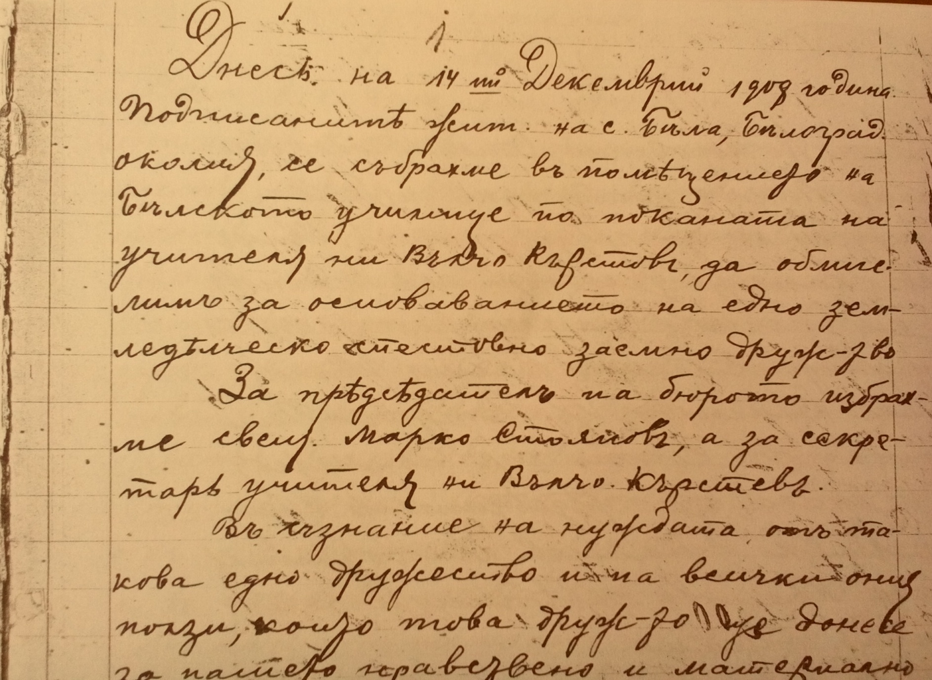 Днесъ на 14 ти Декемврий 1908 година подписаните жит. На с.Бела, Белоград. Околия, се събрахме въ помещението на Белското училище по поканата на учителя ни Вълчо Кръстевъ, да обмислимъ за основаването на едно земледелческо спестовно заемно дружество.