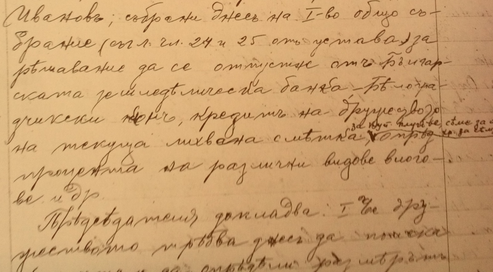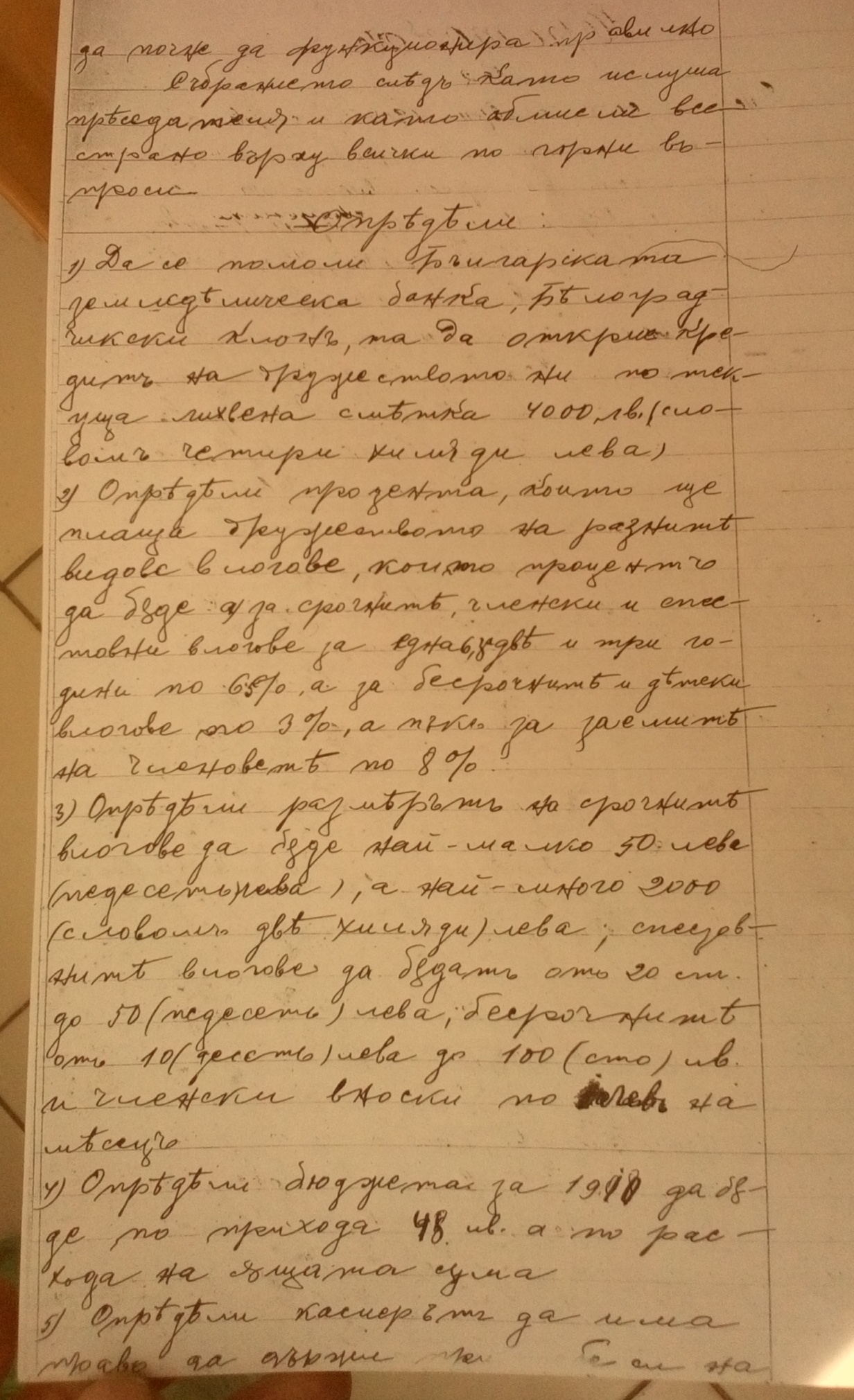 1.Да се помоли Българската земледелческа банка, белоградчишки клонъ, та да открие кредитъ на дружеството ни по текуща лихвена сметка 4000 лв. /словомъ четири хиляди лева/