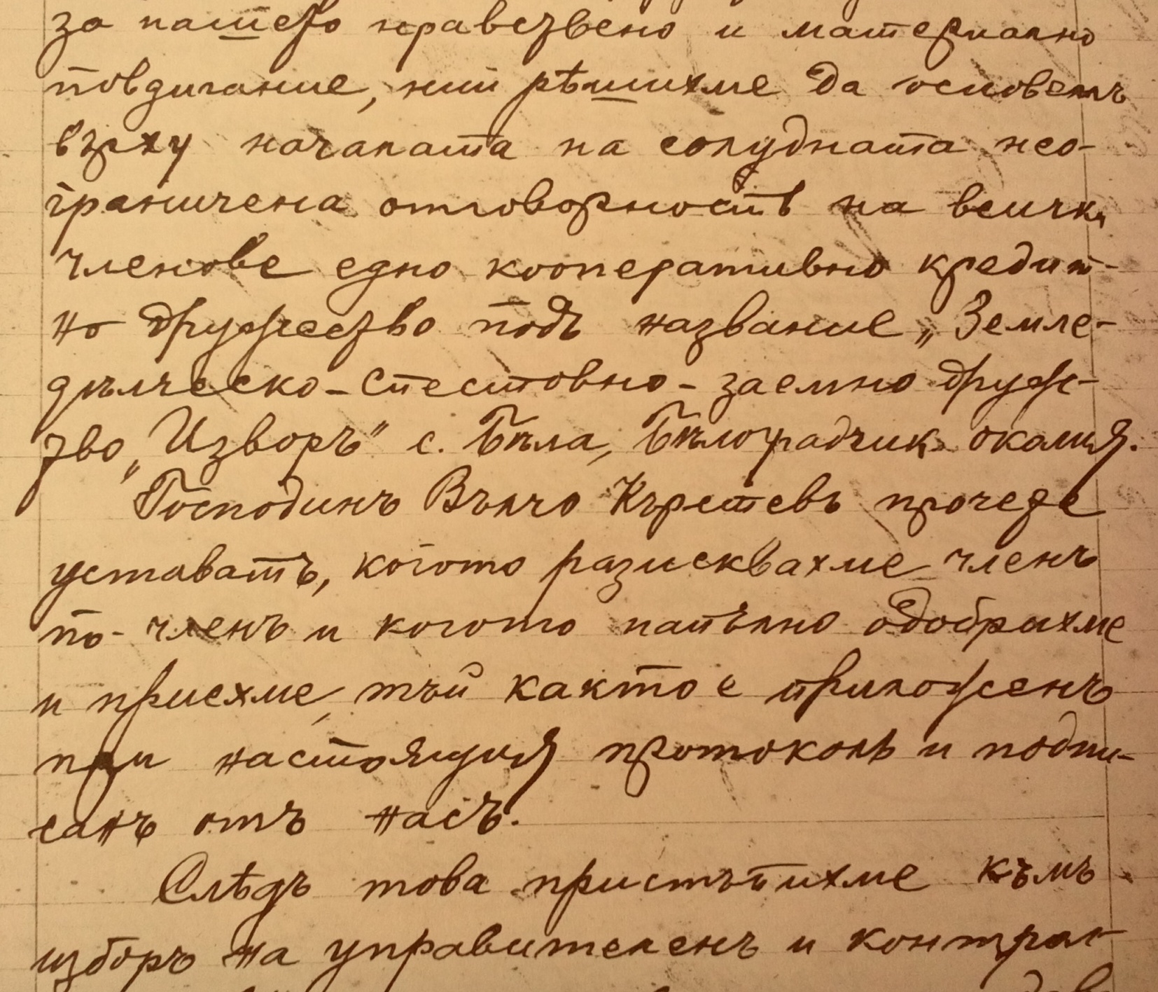 Въ съзнание на нуждата отъ такова едно дружество и на всички ония ползи, които това дружество ще донесе за нашето нравствено и материално повдигание, ний решихме да основемъ върху началата на солидната неограничена отговорностъ на всички членове едно кооперативно кредитно дружество подъ название “Земледелческо-спестовно-заемно дружество “Изворъ” с.Бела, Белоградчишка околия.