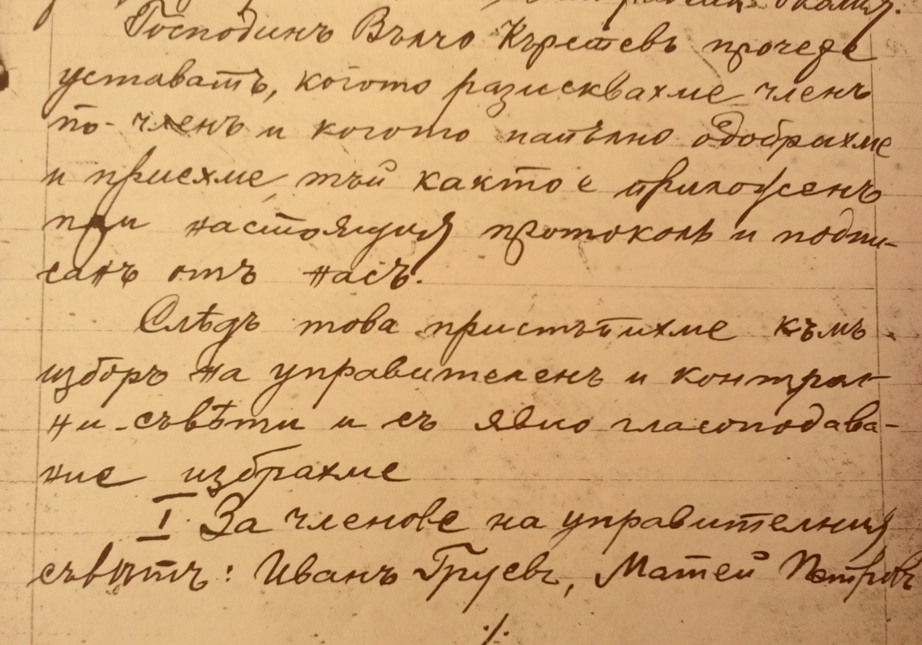 1.За членове на управителния съветъ: Иванъ Груевъ, Матей Петровъ, Иванъ Н.Коравский, Спасъ Тодоровъ и Маринъ Пановъ, които пъкъ избраха по-между си за председателъ: Иванъ Груевъ
