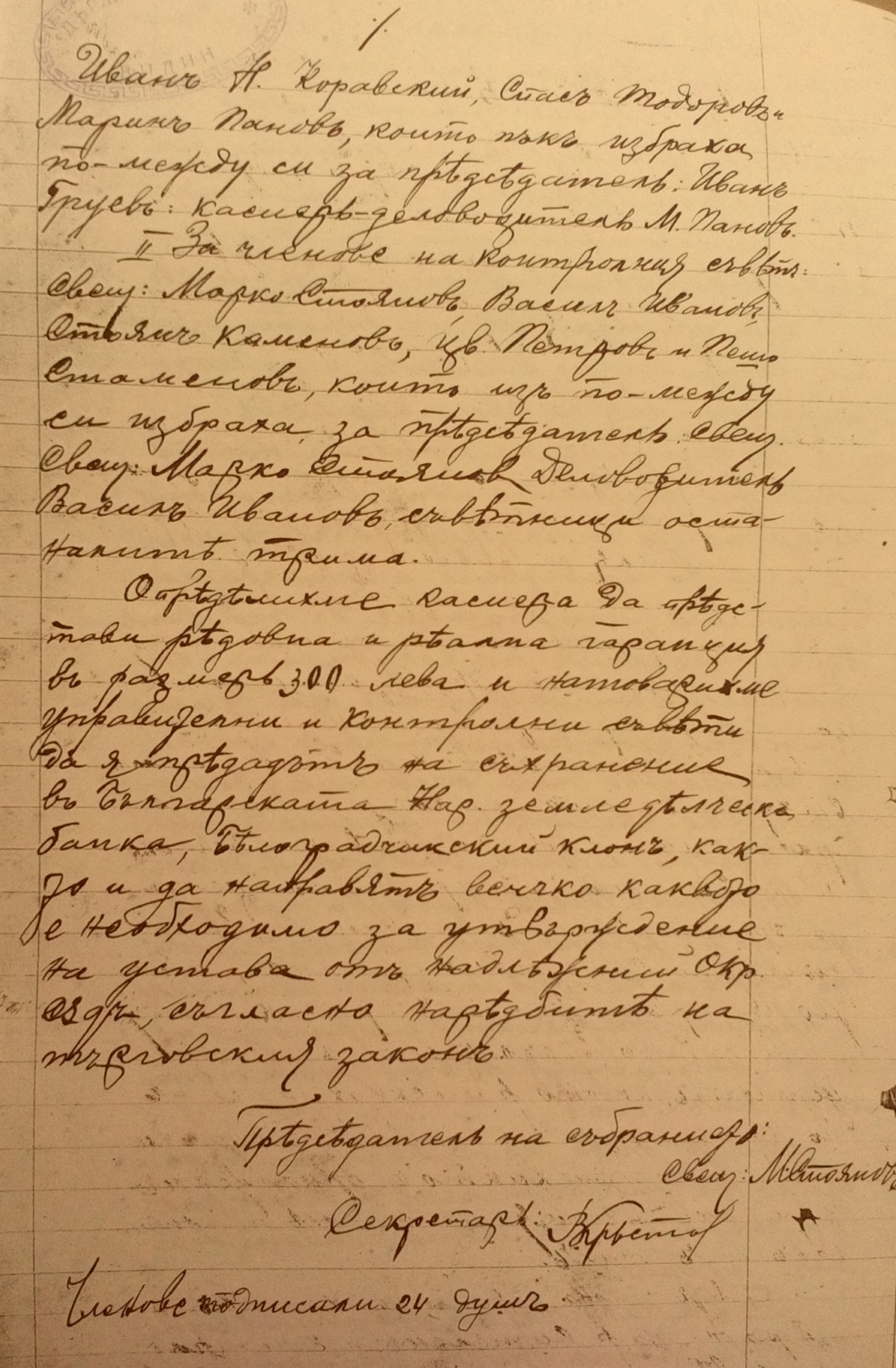 Определихме касиера да представи редовна и реална гаранция въ размеръ 300 лева и натоварихме управителни и контролни съвети да я предадатъ на съхранение въ Българската Нар. Земеделческа банка, Белоградчишкий клонъ, както и да направятъ всичко каквото е необходимо за утвърждение на устава отъ надлежний окр. Съдъ, съгласно наредбите на търговския законъ.