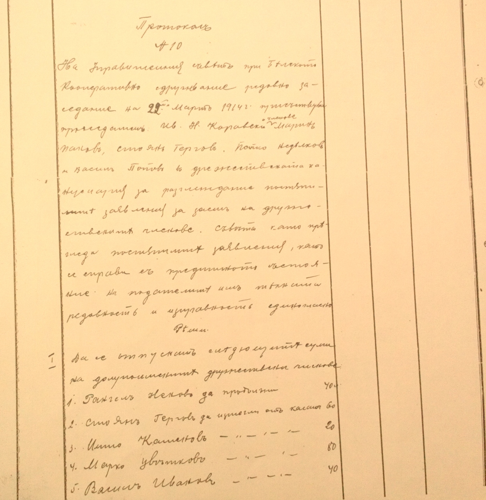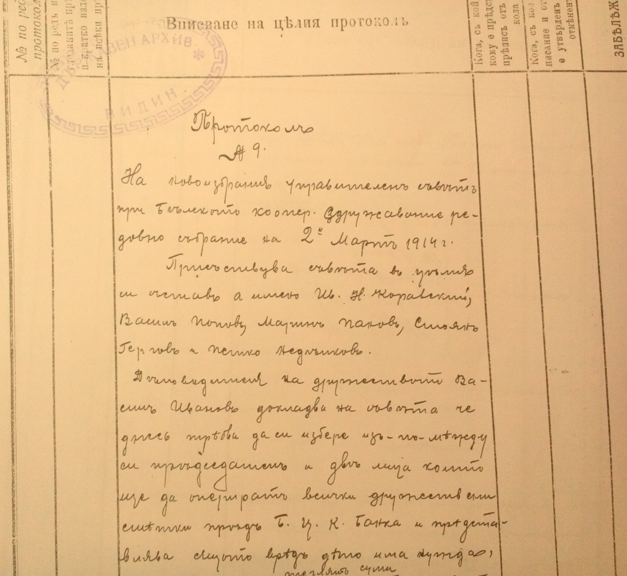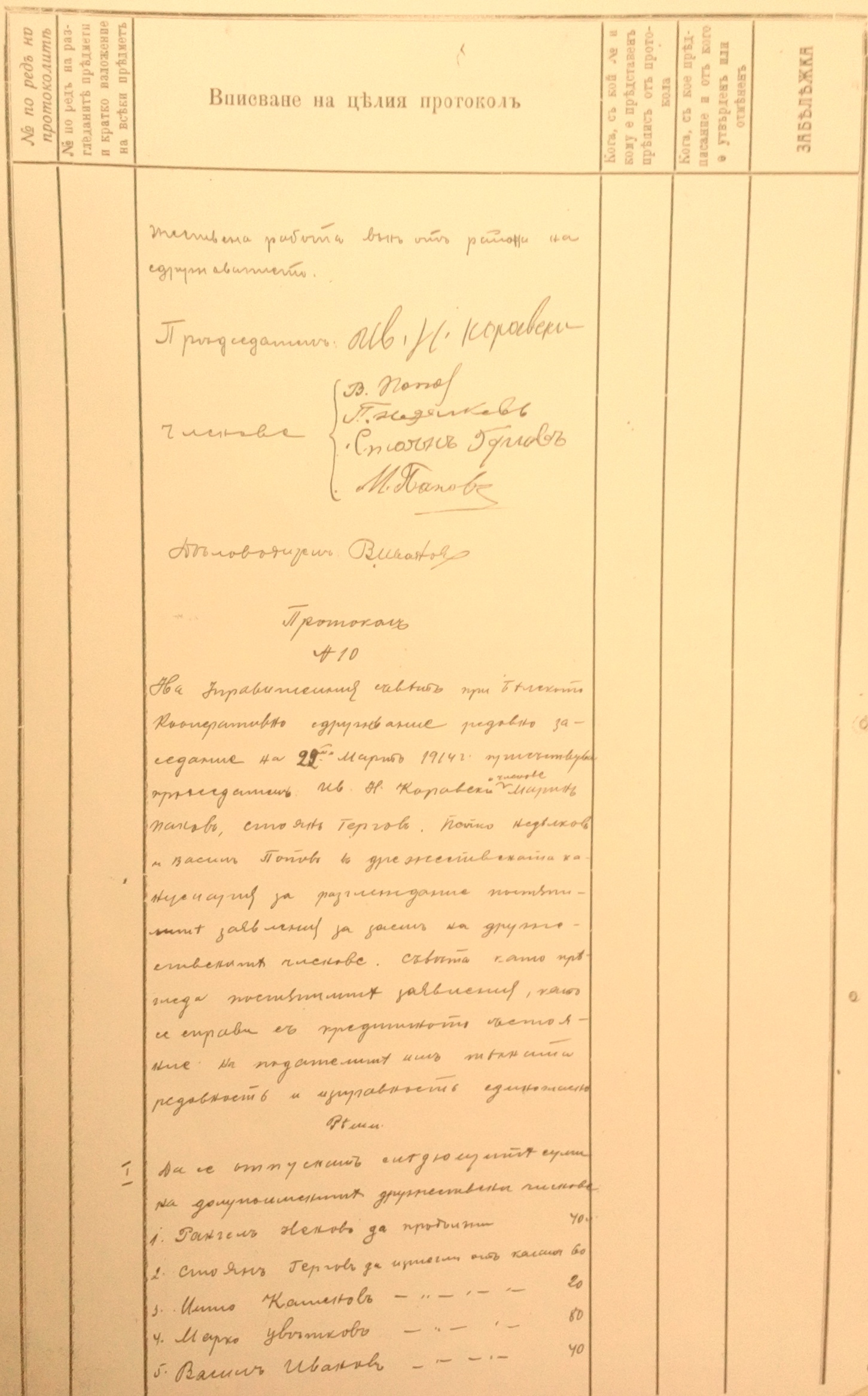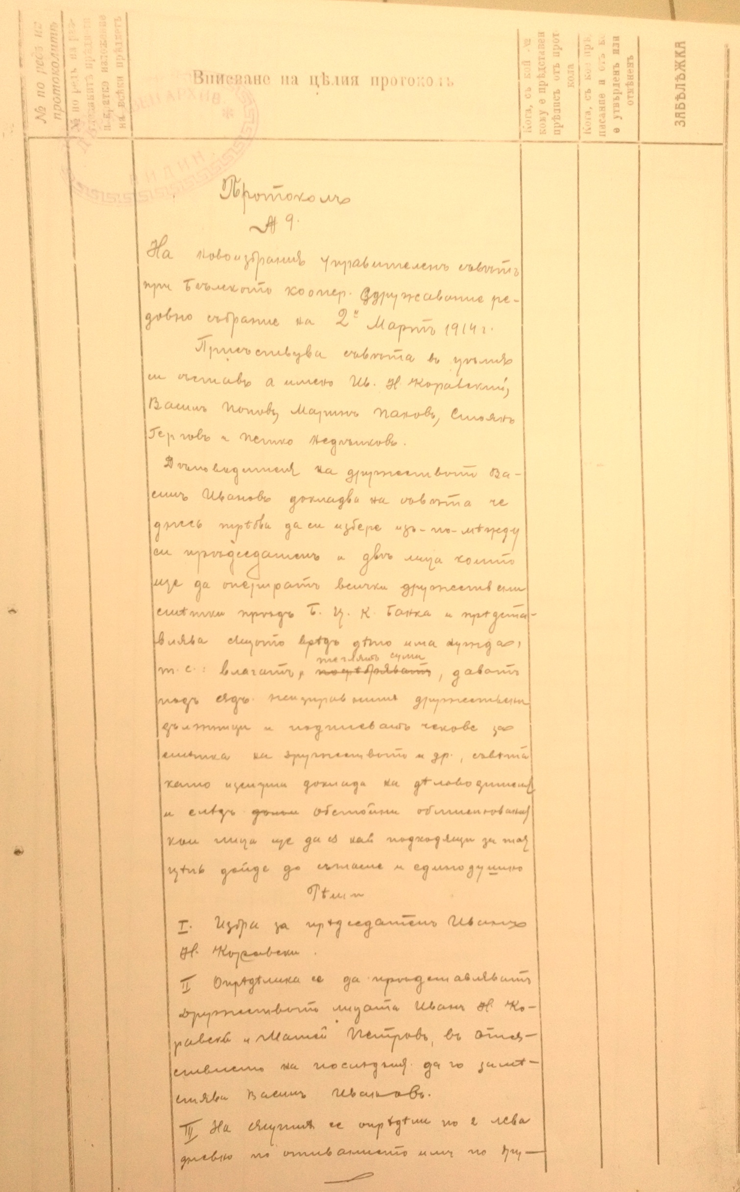 …02.03.1914 год. Присъствува съвета в целия си състав, а именно: Иван Ненов Коравский, Васил Попов, Марин Панов, Стоян Гергов и Петко Недялков….