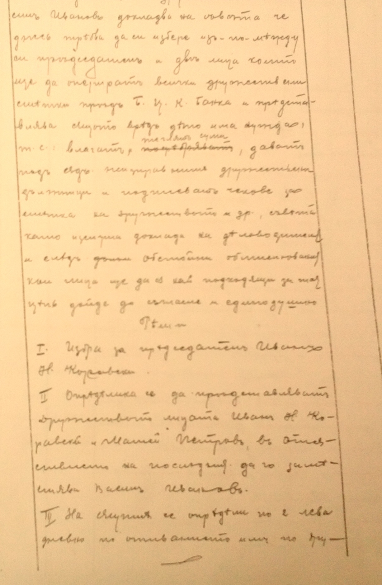 …Деловодителя на дружеството Васил Иванов докладва,……трябва да се изберат две лица които да оперират всички дружествени сметки пред Б.Ц.К. Банка и представляват същото пред дето трябва…..