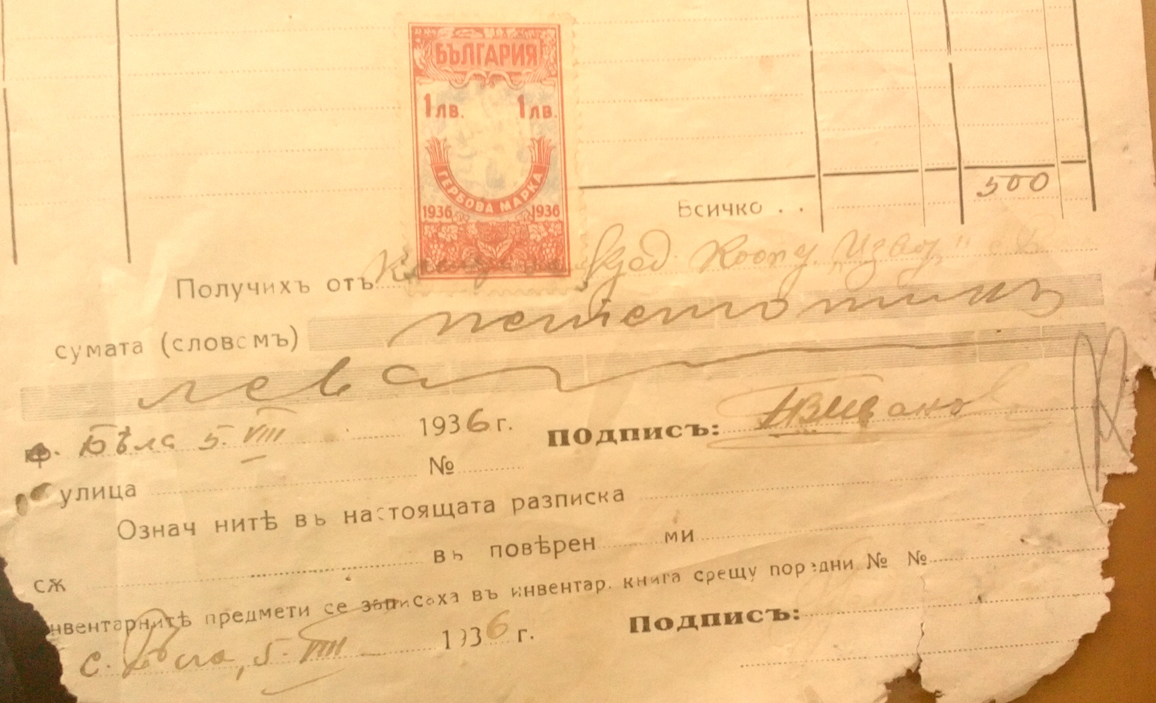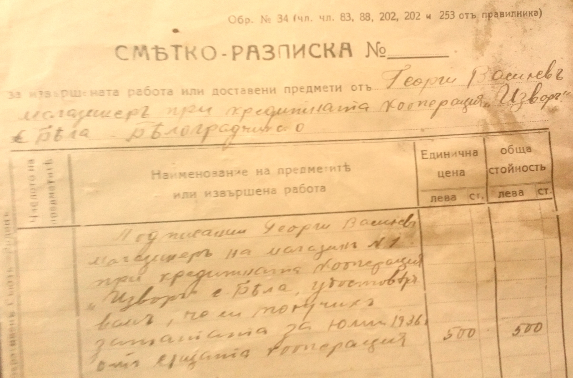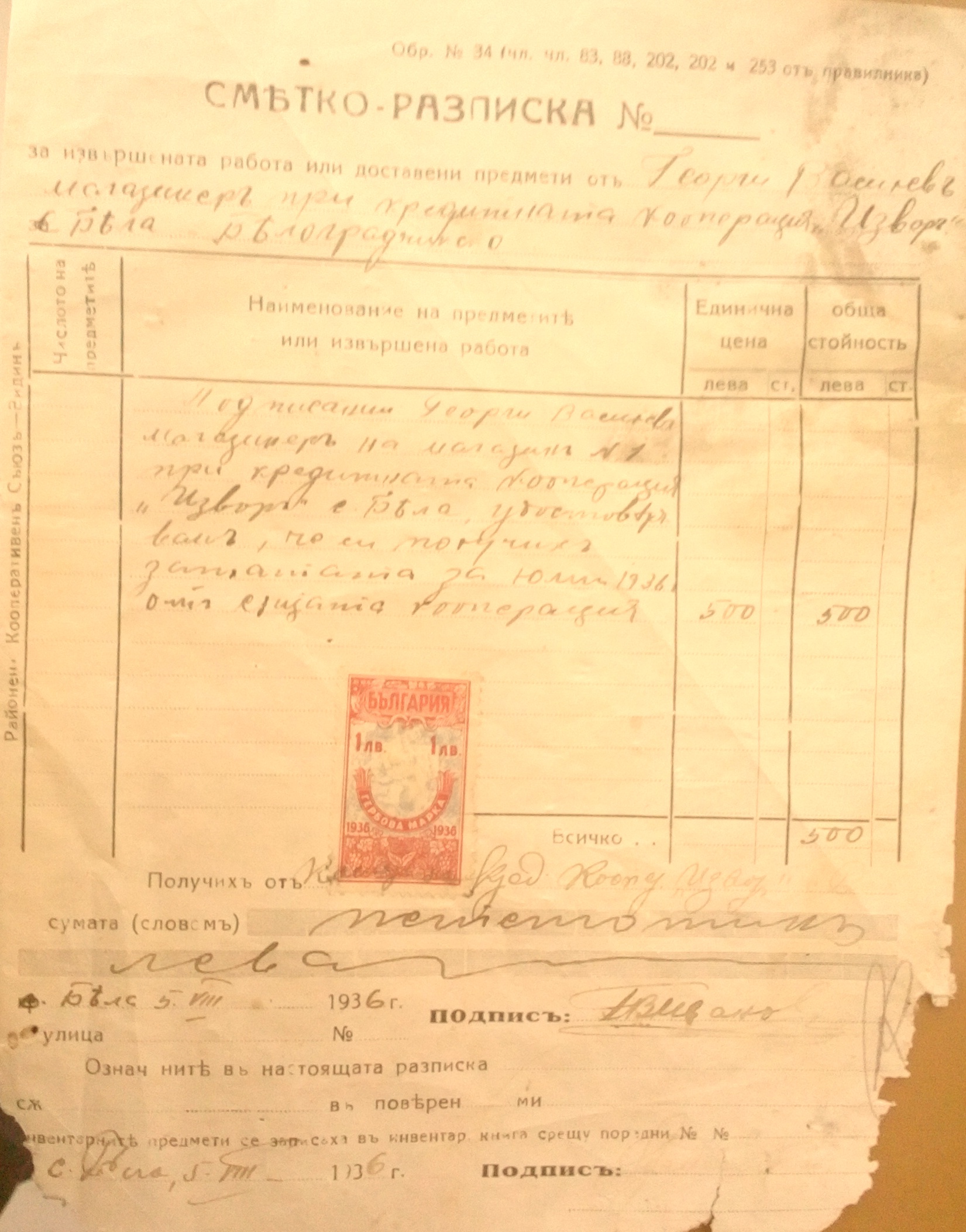 Подписаний Георги Василев магазинер на Магазин N 1 при Кооперация „Извор“ село Бела, удостоверявам, че получих заплатата за Юли 1936 год….