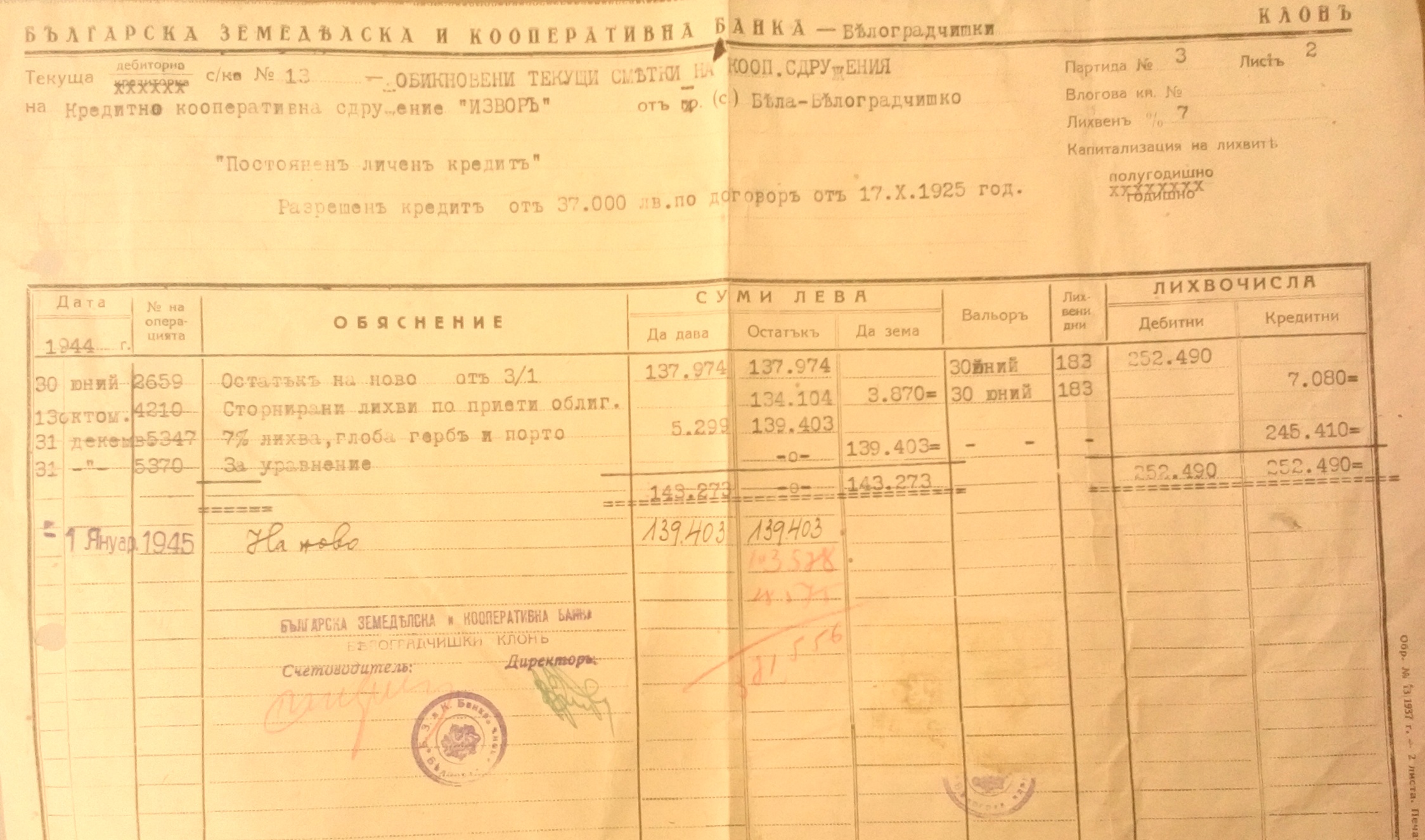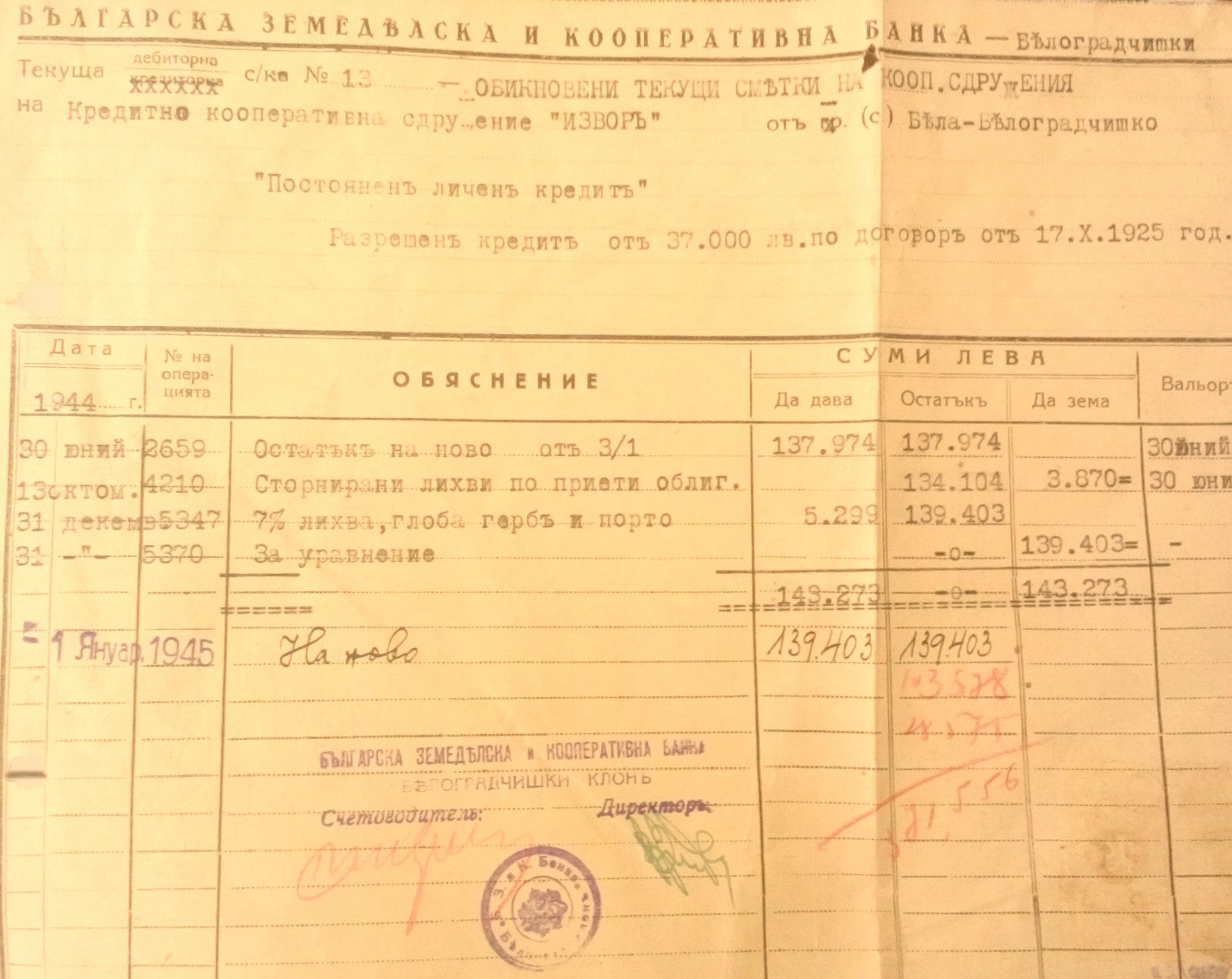 Разрешен кредит от 37000 лева по договор от 17.10.1925 година.