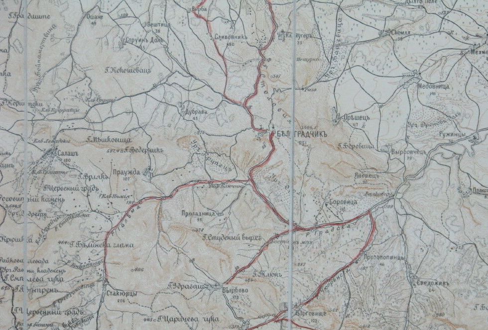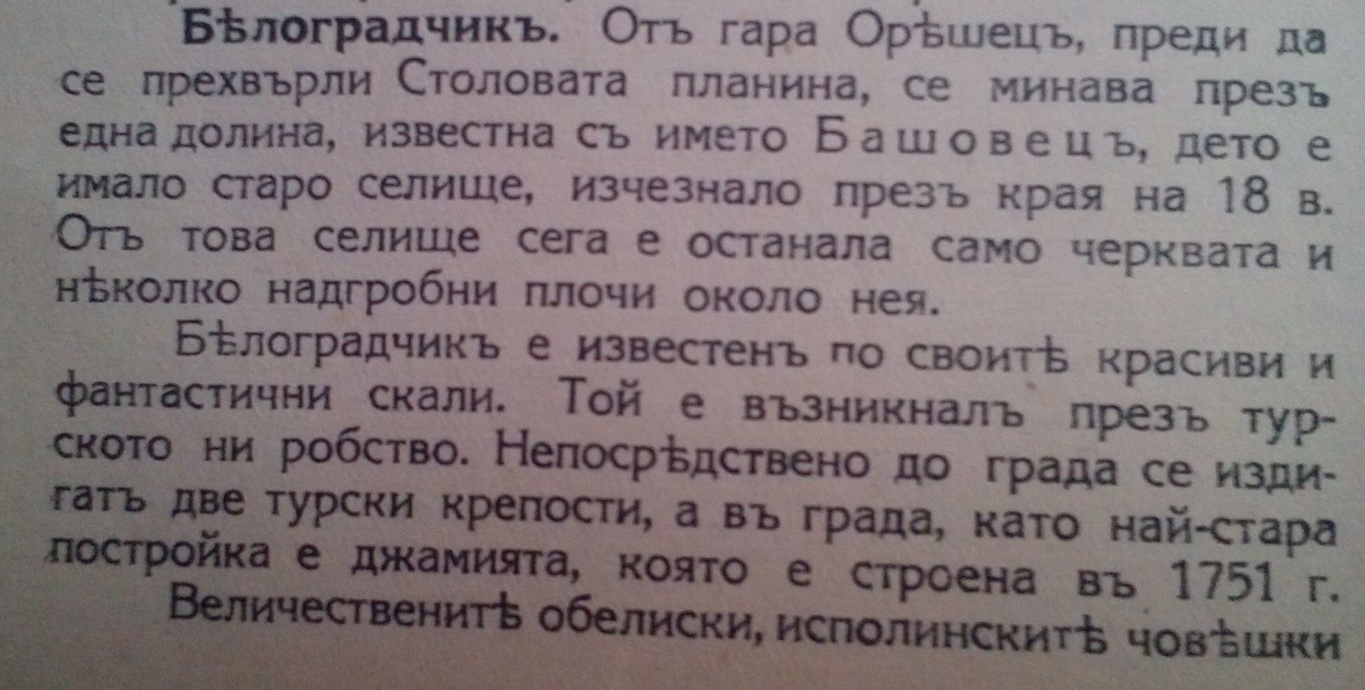„Белоградчик. От гара Орешец, преди да се прехвърли Столова планина, се минава през една долина, Известна с името Башовец (по нашему Башовица), дето е имало старо селище, изчезнало през 18 век. От това селище сега е останала само черквата и няколко надгробни плочи около нея ….. „
