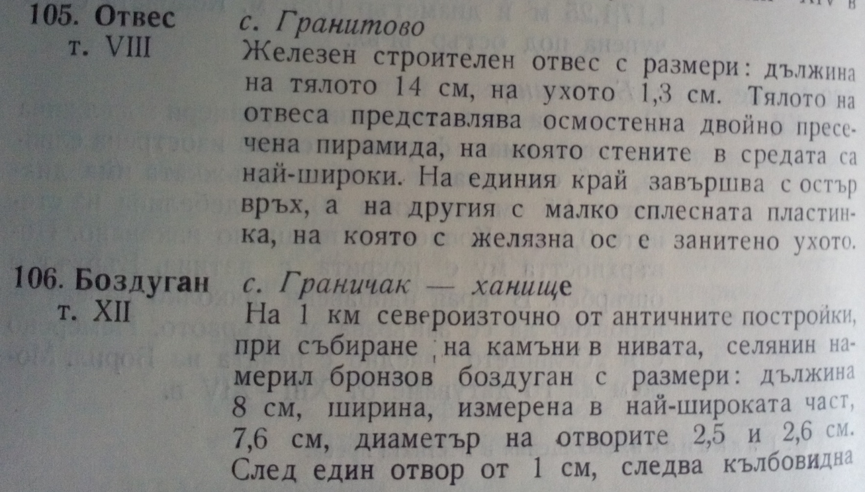 Железен строителен отвес с размери: дължина на тялото 14 см, на ухото 1,3 см. Тялото на отвес представлява осмостенна двойно пресечена пирамида, на която стените в средата са най-широки. На единия край завършва с остър връх, а на другия с малка сплесната пластинка, на която с желязна е занитено ухото.