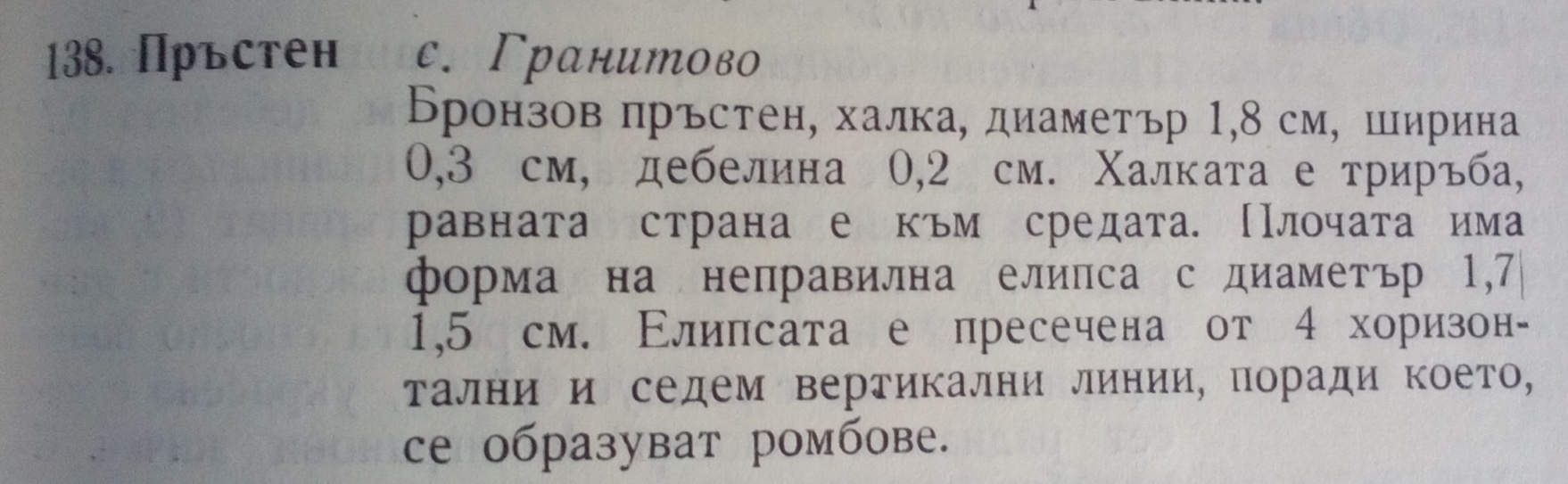 Бронзов пръстен, халка, диаметър 1,8 см, ширина 0,3 см, дебелина 0,2 см. Халката е триръба, равната страна е към средата. Плочта има форма на неправилна елипса с диаметър 1,7/1,5 см. Елипста е пресечена от 4 хоризонтални и седем вертикални линии, поради което, се образуват ромбове.
