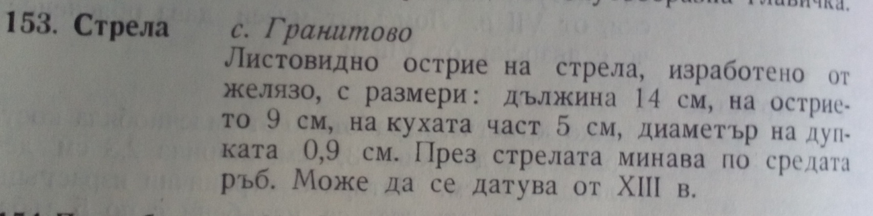 Листовидно острие на стрела, изработено от желязо, с размери: дължина 14 см, на острието 9 см, на кухата част 5 см, диаметър на дупката 0,9 см. През стрелата минава по средата ръб. Може да се датува от 13 в.