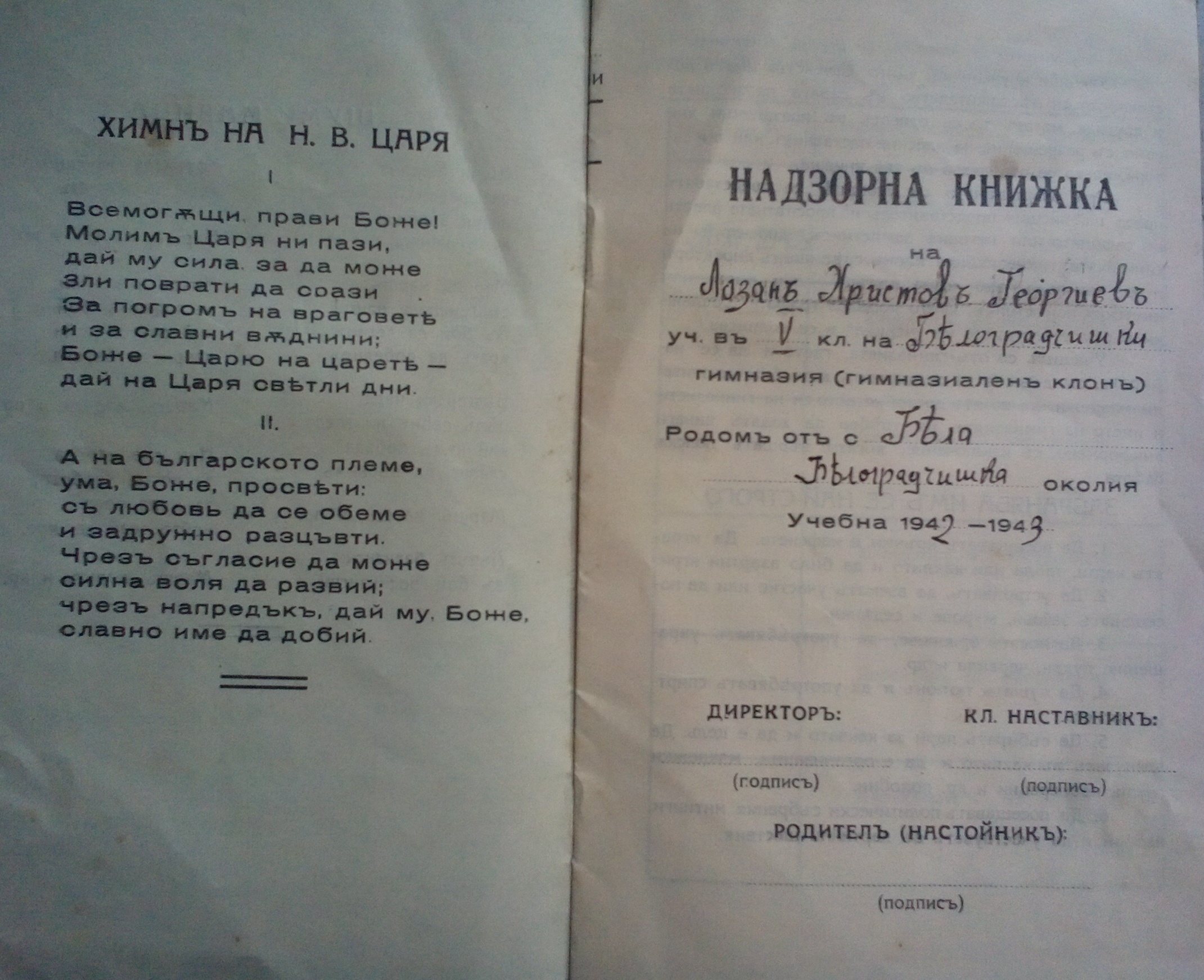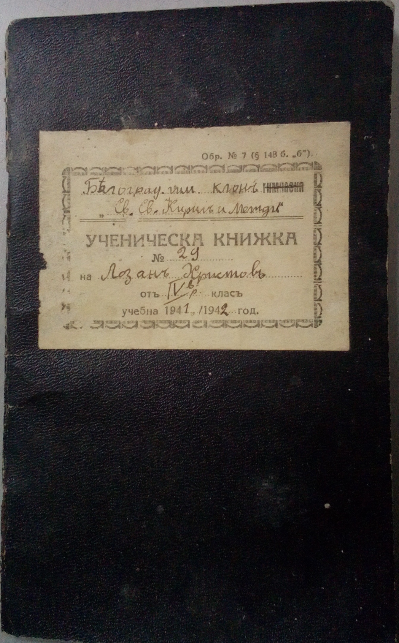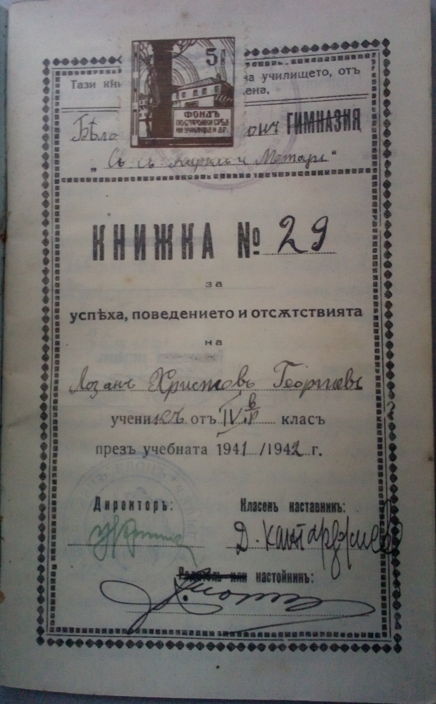 Книжка N 29 за успеха, поведението и отсъствията на ученика Лозан Христов Георгиев ученик от 4 ти клас през учебната 1941/1942 година.