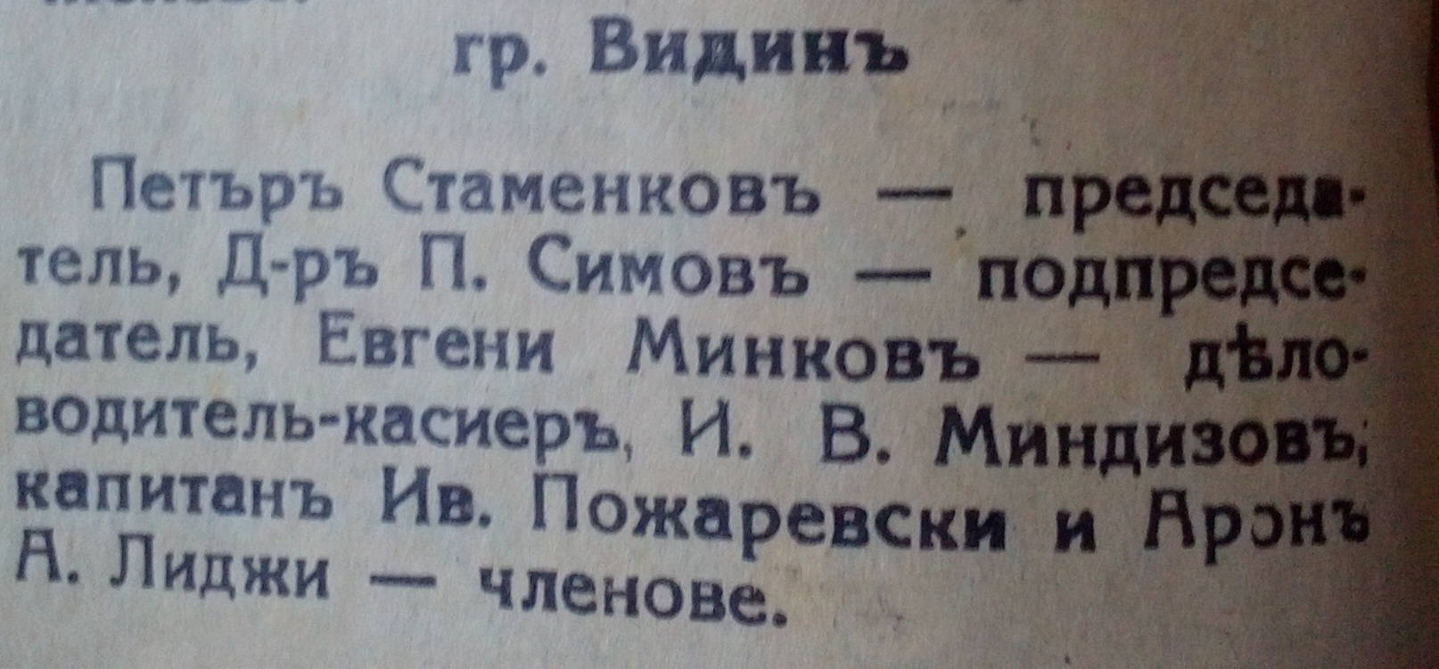 Предсдател: Петър Стаменков; Подпредсдател: Д-р П.Симов; деловодител-касиер: Евгени Минков; Членове: 1. Капитан И.В.Миндизов; 2. Ив.Пожаревски; 3. Арон А.Лиджи