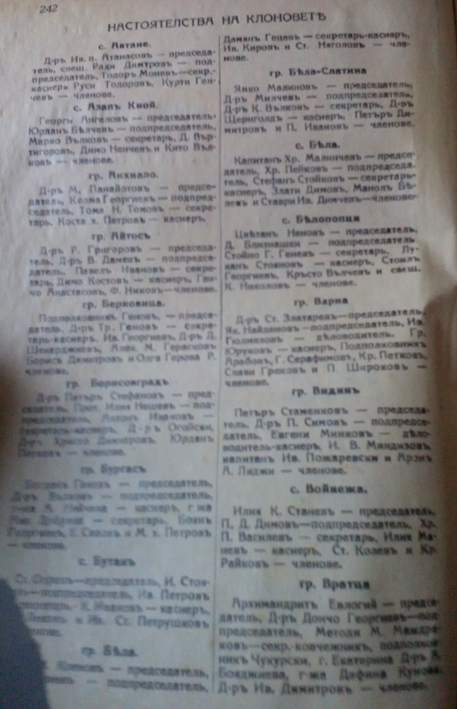 Предсдател: С.Ив.Табаков; Подпредсдател: Д-р Плакидов; Касиер: Цв.Тодоров; Секретар: Д-р Цеков; Членове: 1. Д-р Кърджиев; 2. Трифон Илиев