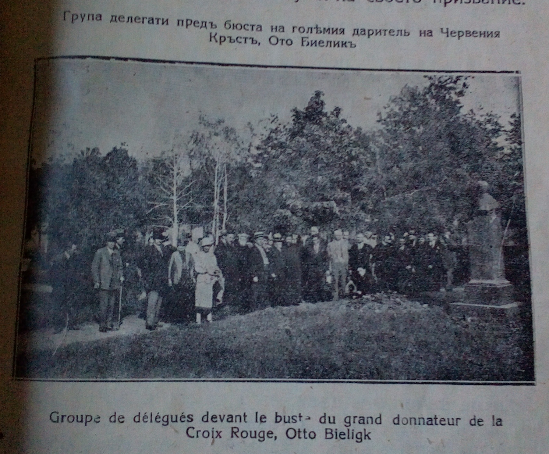 Група делегати пред бюста на големия дарител на Червения Кръст – Ото Биелик.