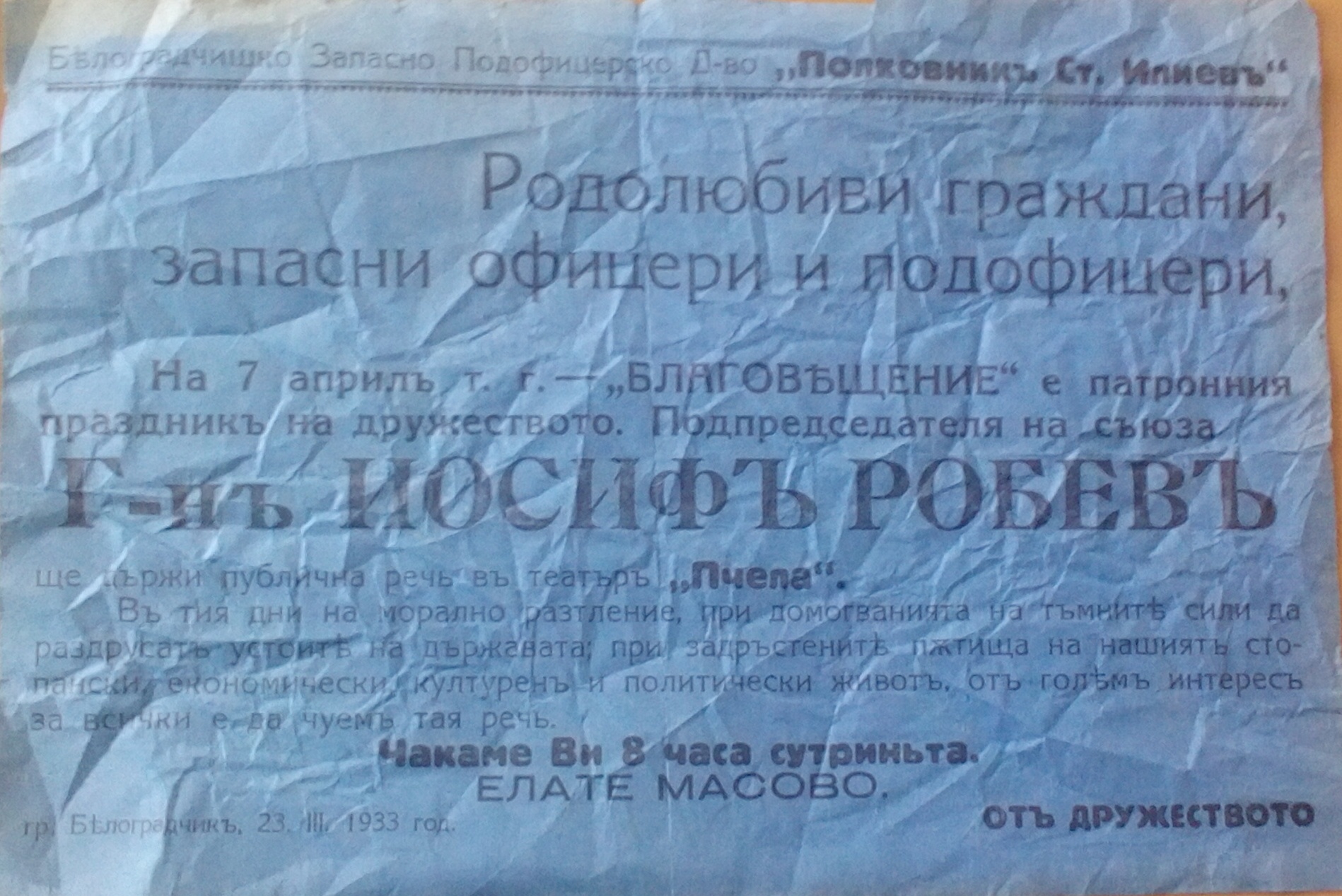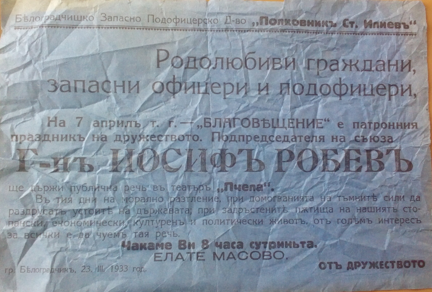 През 1910г. се създава и Съюз на запасните подофицери начело със запасния подофицер Йосиф Робев. Родоначалник на тази организация е софийското дружество на подофицерите „Гургулят“, което е създадено през 1906г., Но започва да води по-интензивен живот през 1908 г.
