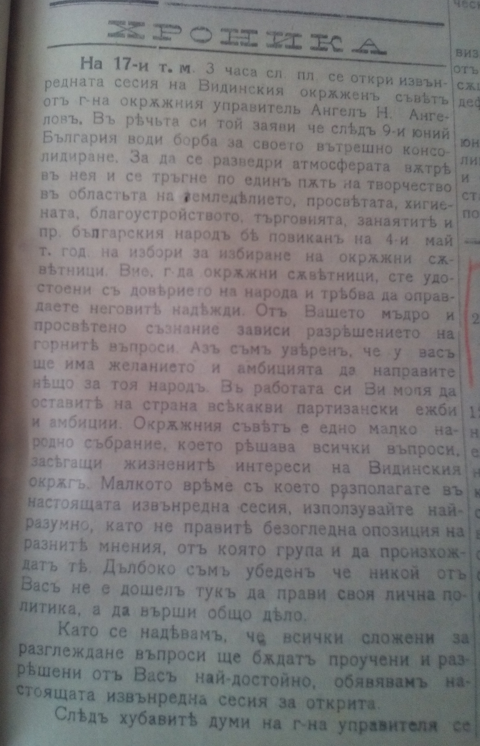 На 17-т.м. в 3 часа след пладне се откри извънредната сесия на Видинския Окръжен съвет от г-на окръжния управител Ангел Н. Ангелов