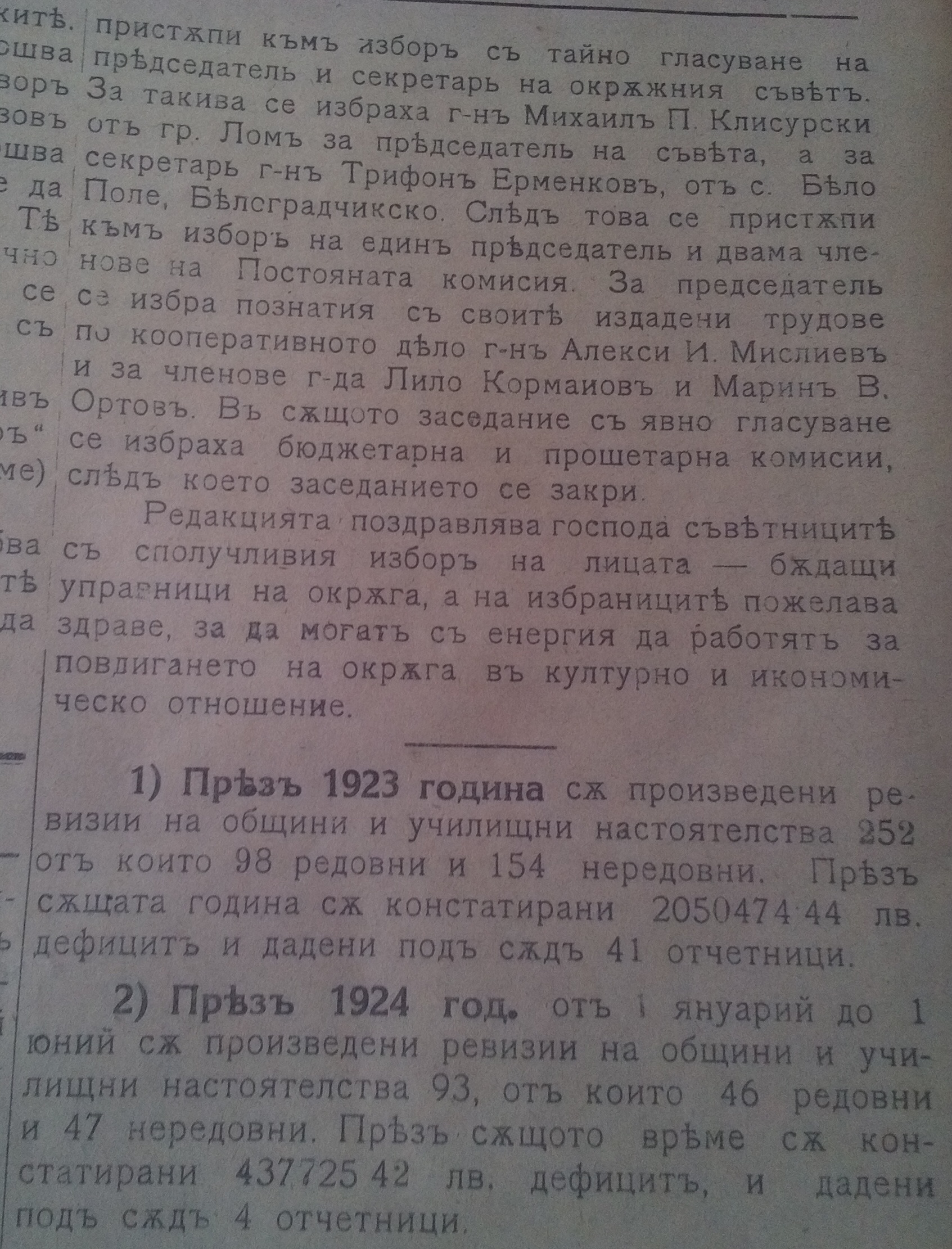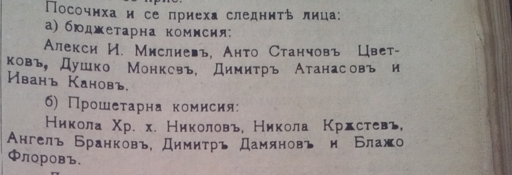 Предсдател на Постоянната Комисия: г.Алекси И. Мислиев от с.Горна Гнойница, Ломско.сега Септемврийци,Монтанско (Известен със своите трудове по Кооперативното дело)