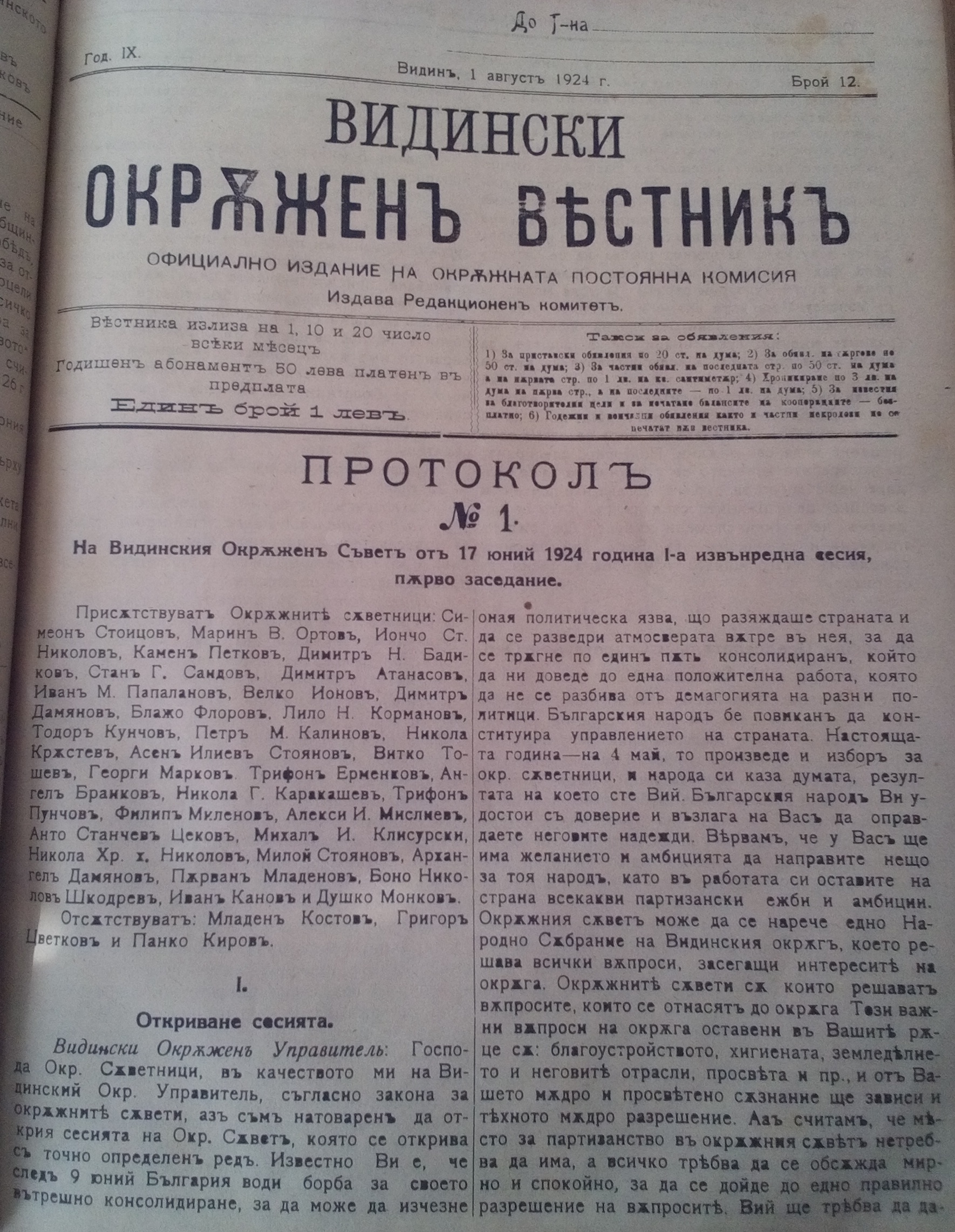Видинския Окръжен Съвет от 17 Юний 1924 година 1-ва извънредна сесия, първо заседание.