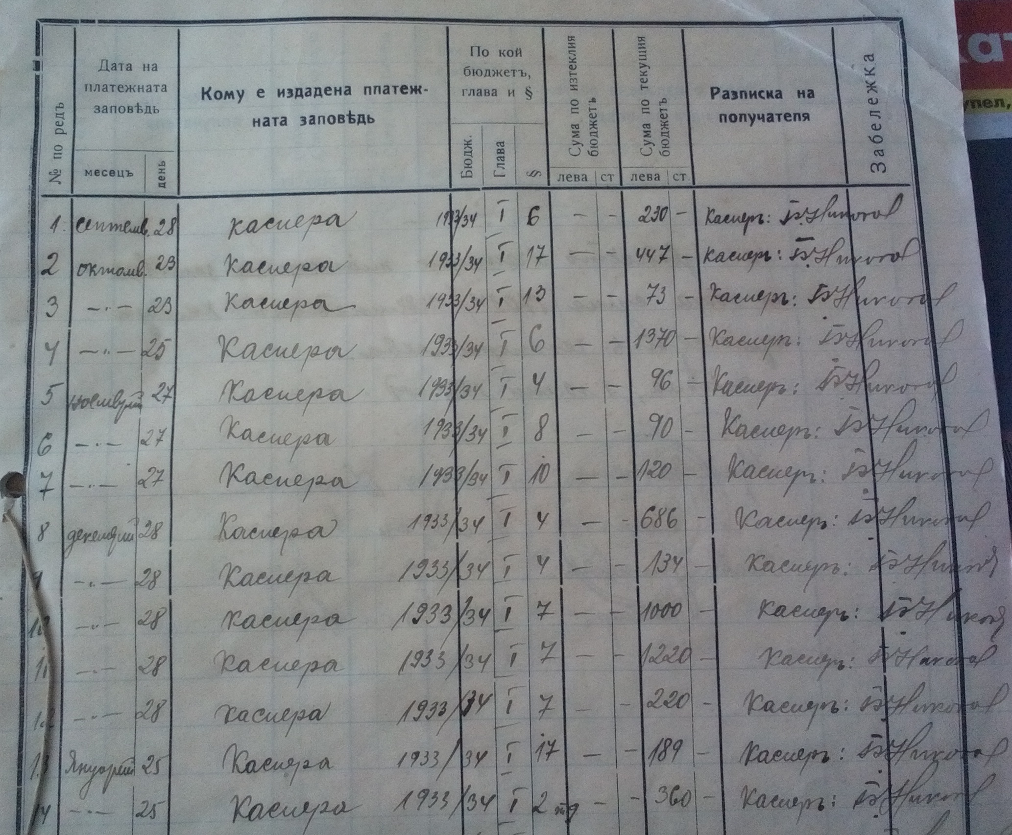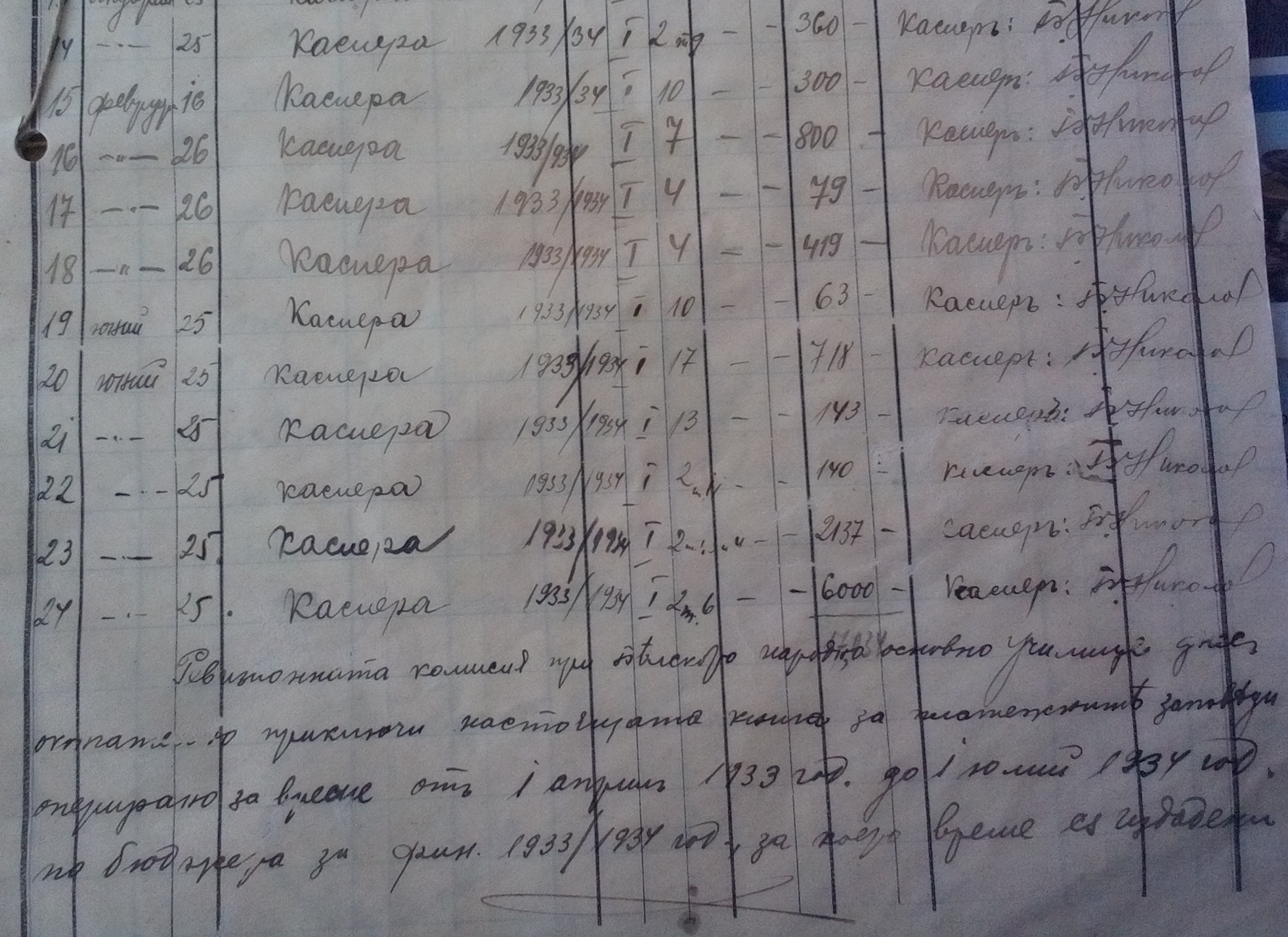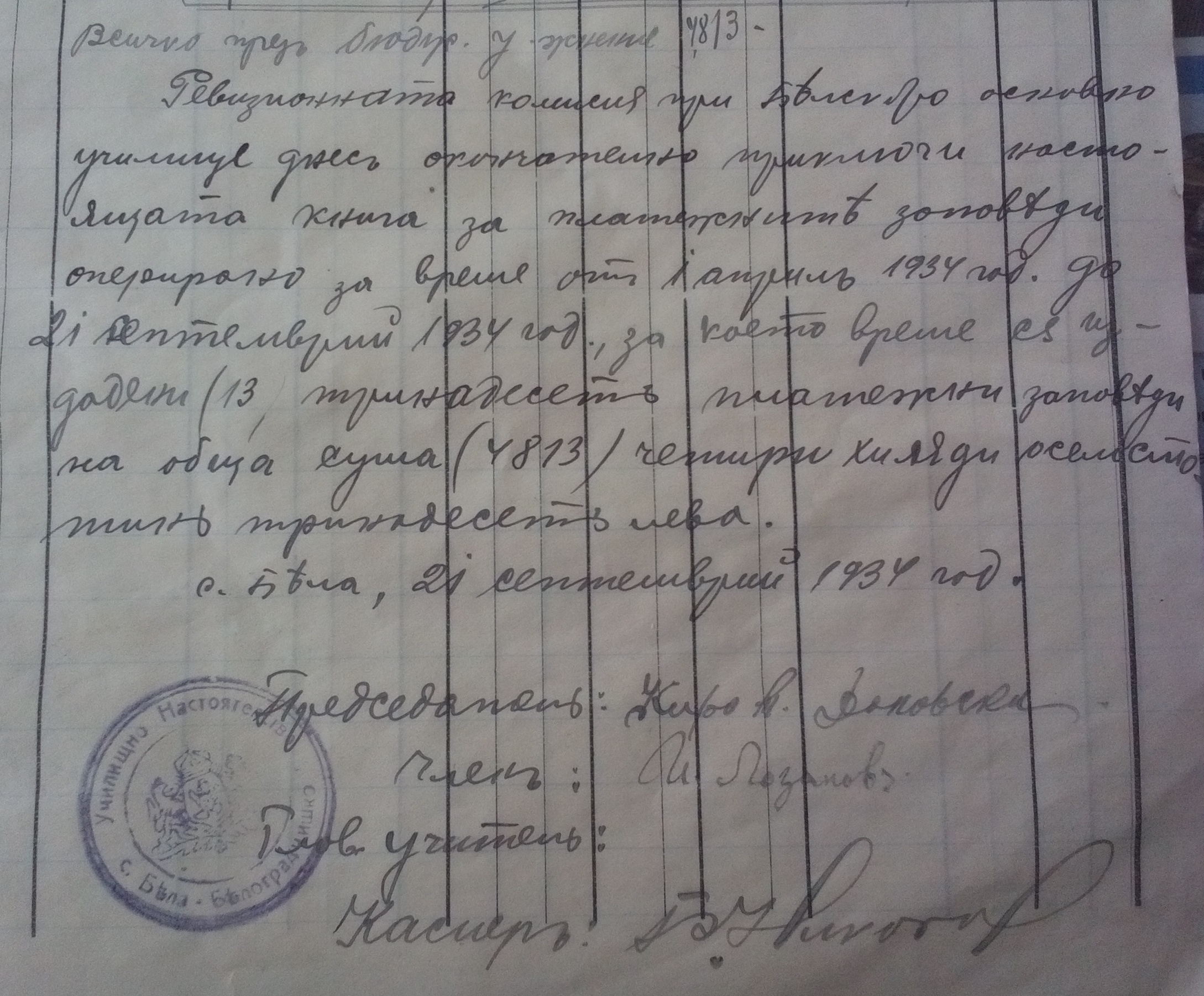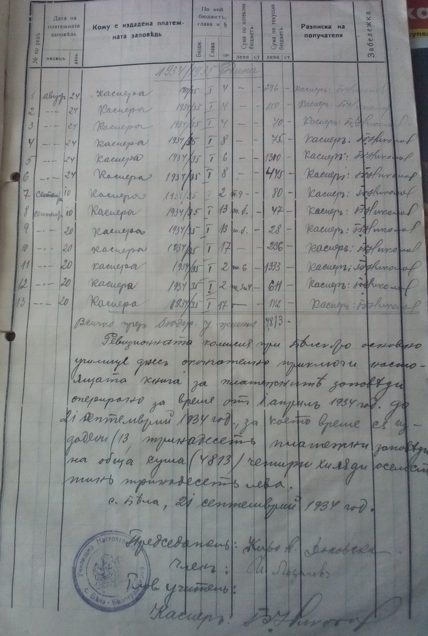 Ревизионната комисия при Белското Народно Основно Училищно Настоятелство приключи настоящата книга за платежни заповеди , оперирано за време от 01.04.1933 г. до 01.07.1934 г. по бюджета за финансовата 1933/34 г. за което време са издадени 24 (двадесет и четири) платежни заповеди за обща сума 17034 лева.