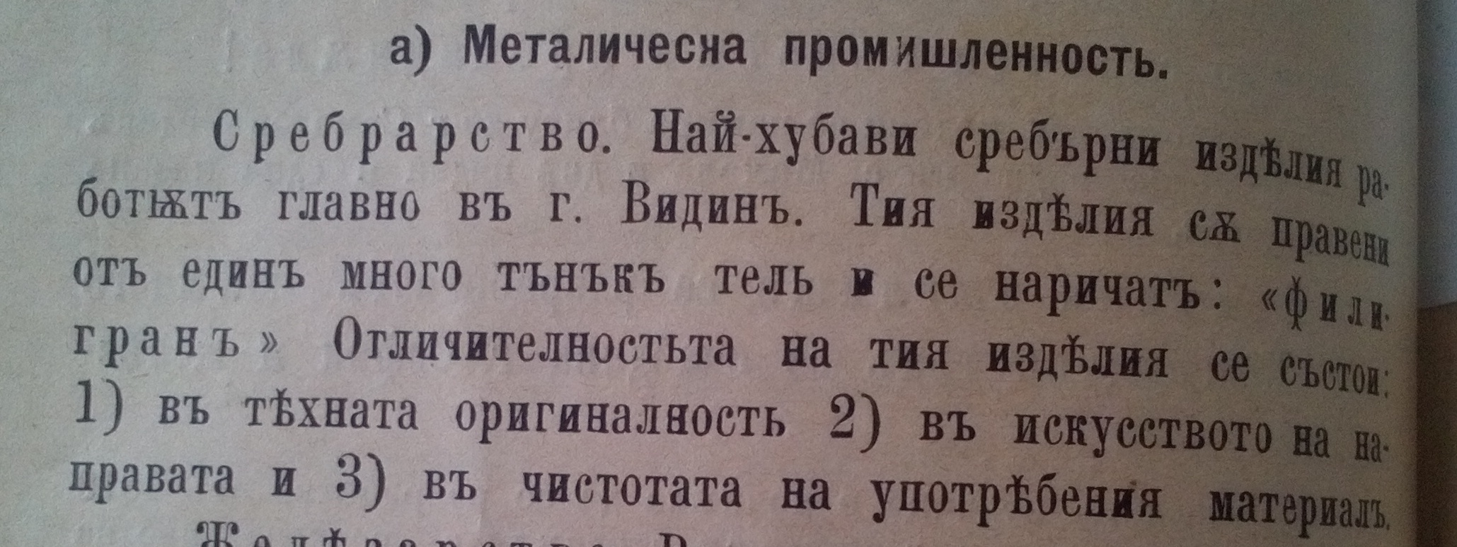Най-хубавите сребърни изделия се работят главно в гр.Видин. Тези изделия са правени от един много тънък тел и се наричат „Филигран“. Отличителността на тези изделия се състои в тяхната оригиналност, исзкуство на направата и чистотата на употребявания материал….