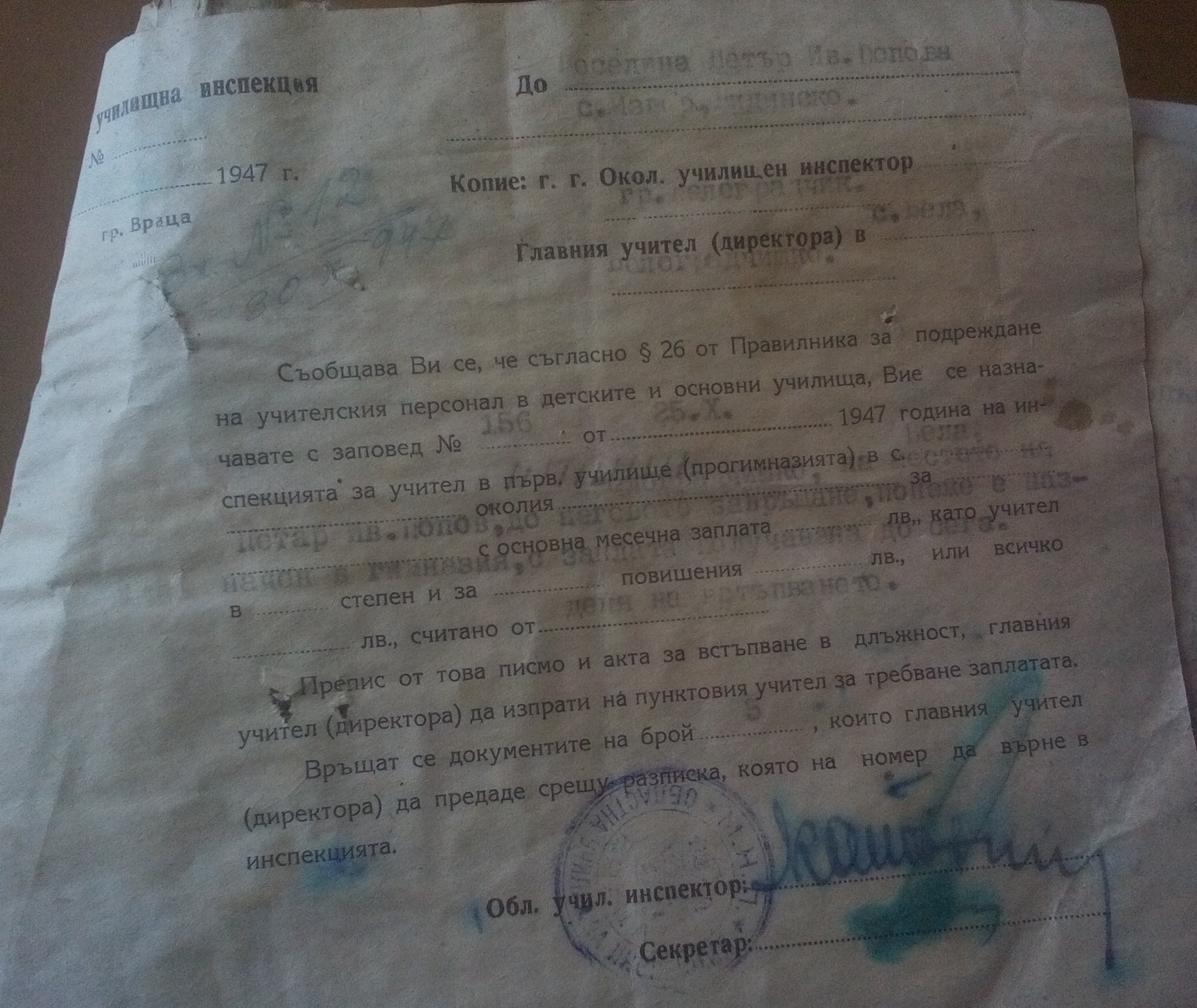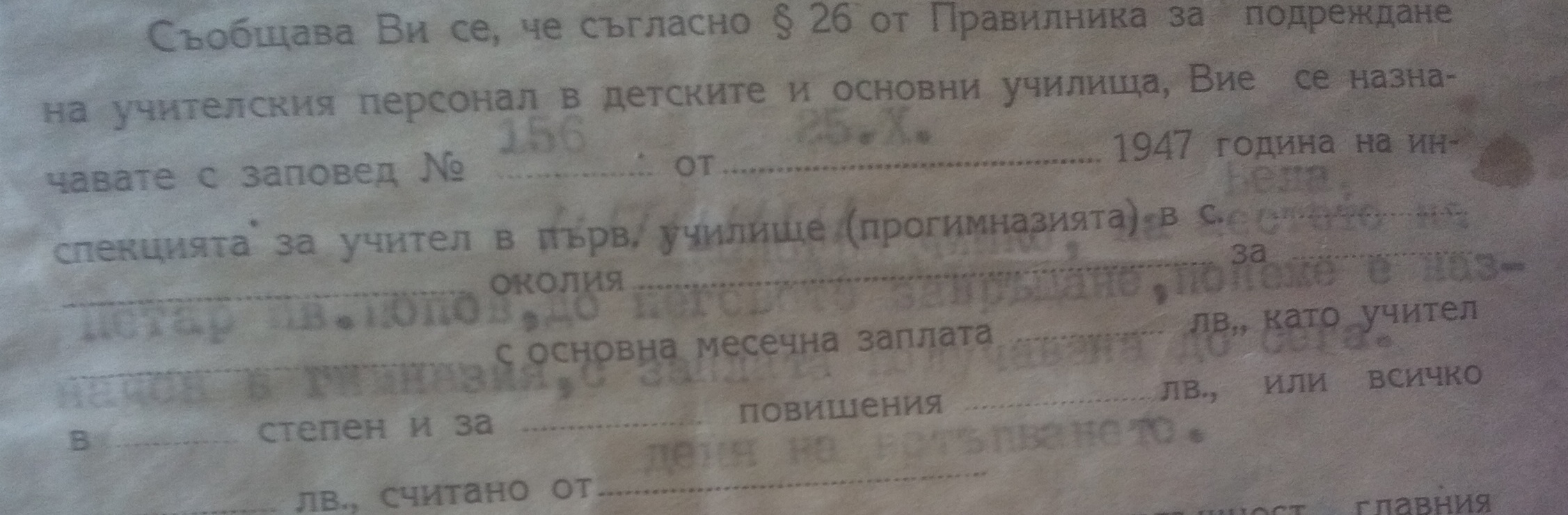 Съобщава Ви се , че съгласно Пар.6 от правилника за подреждане на учителския персонал в детските и основните училища, Вие се назначавате със заповед N 156 / 25.10.1947 г. на инспекцията за учител в първ. училище (прогимназия) в село Бела на мястото на Петър Иванов Попов, до неговото завръщане , понеже е назначен в гимназия, със заплата получавана до сега…..